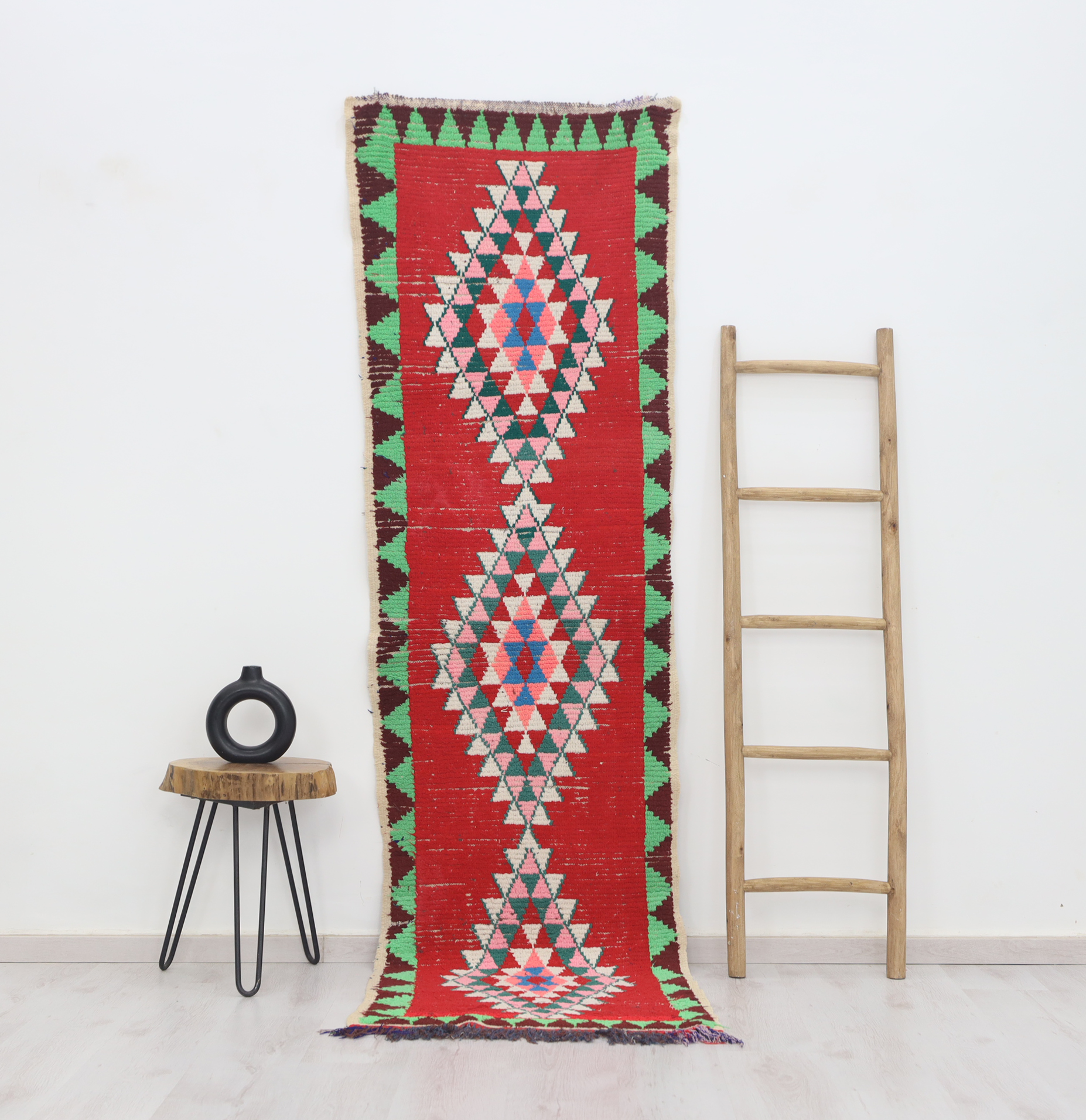 An unparalleled vintage masterpiece, carefully crafted by Berber Tribes in the Boucherouite style using upcycled textiles. Measurements: 2'5" x 8'4" (75 cm x 256 cm),