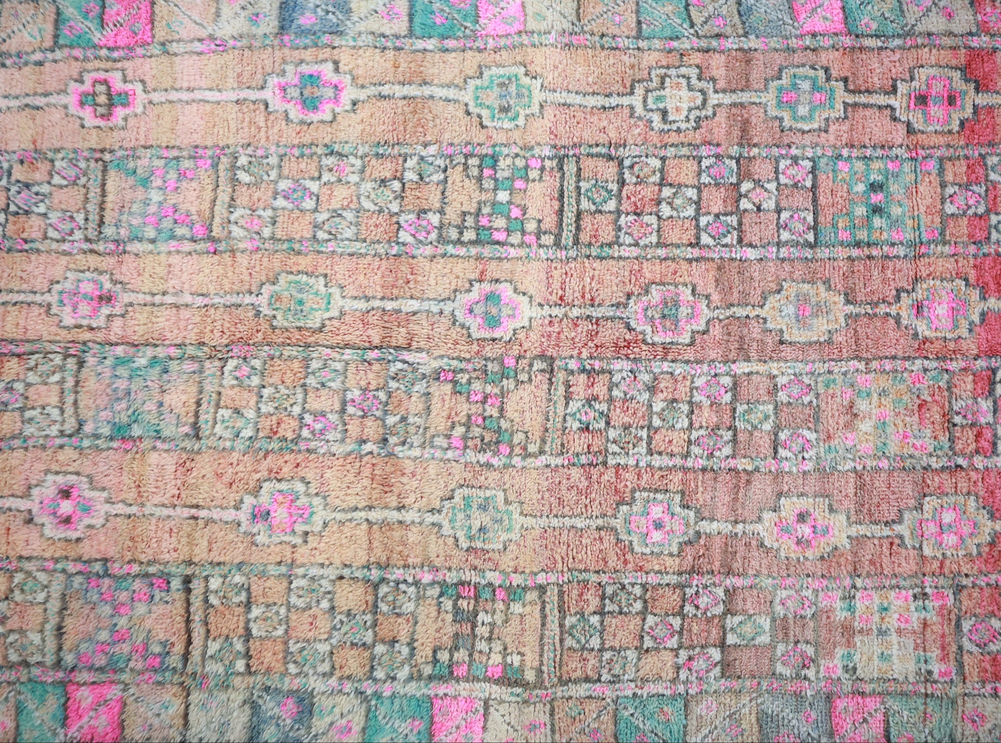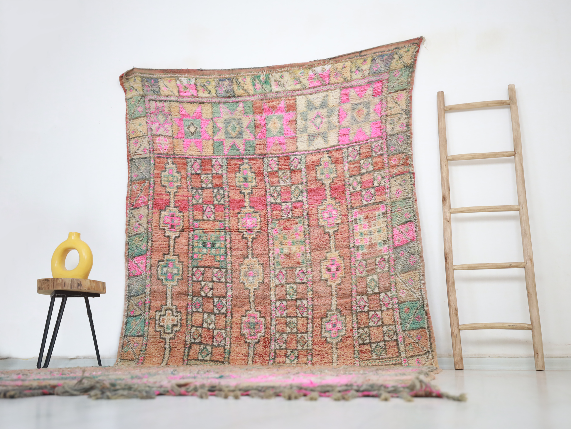 Originating in the Holy town of Boujad, these rugs, woven by diverse tribes, exhibit a wide spectrum of color, composition, and weave. Described as surreal, mystic, and mesmerizing, Boujad rugs transport us to a world beyond reality. Their construction, with twice as many horizontal as vertical knots, renders them floppy and easy to move.