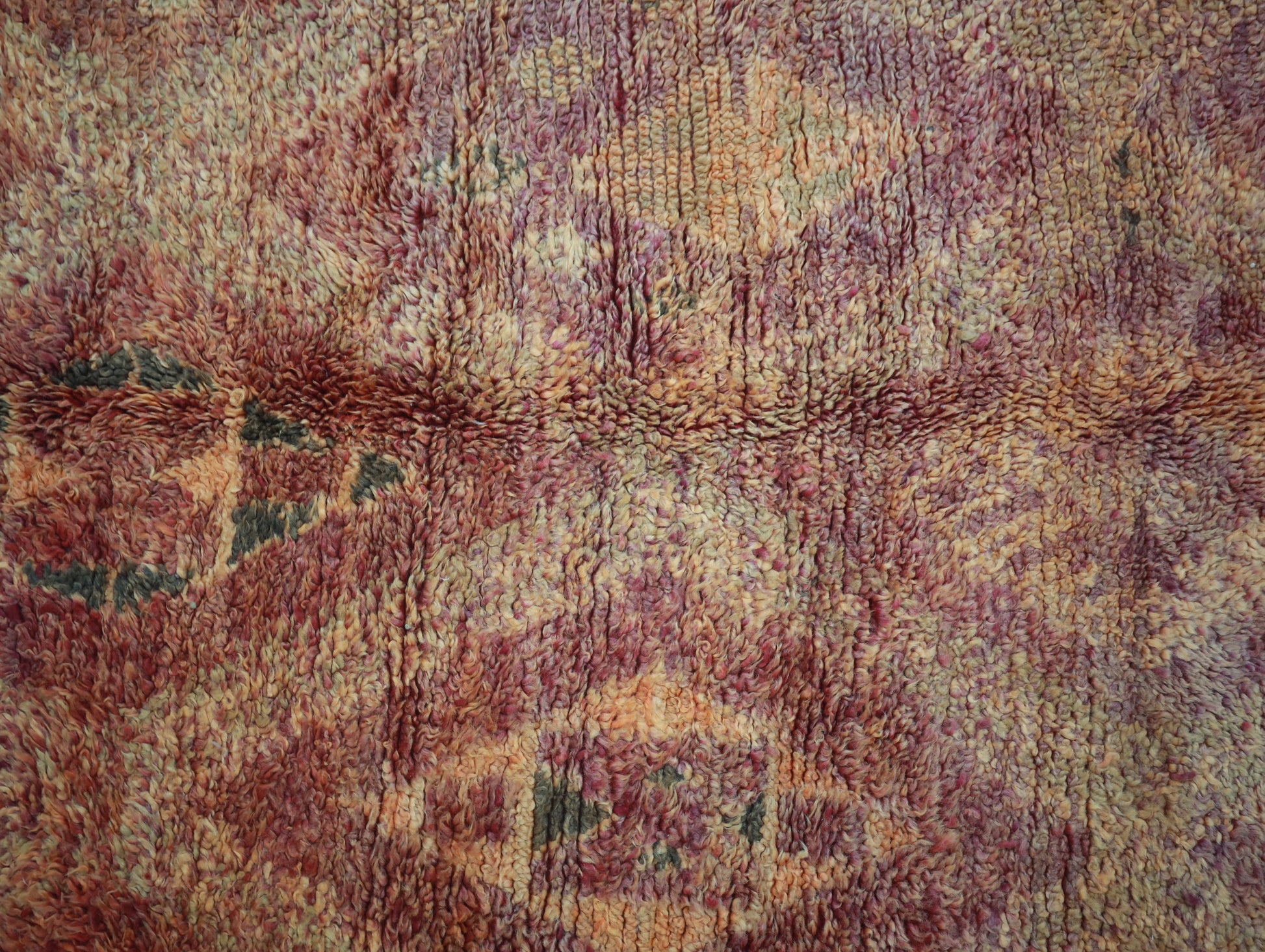 Originating in the Holy town of Boujad, these rugs, woven by diverse tribes, exhibit a wide spectrum of color, composition, and weave. Described as surreal, mystic, and mesmerizing, Boujad rugs transport us to a world beyond reality. Their construction, with twice as many horizontal as vertical knots, renders them floppy and easy to move.