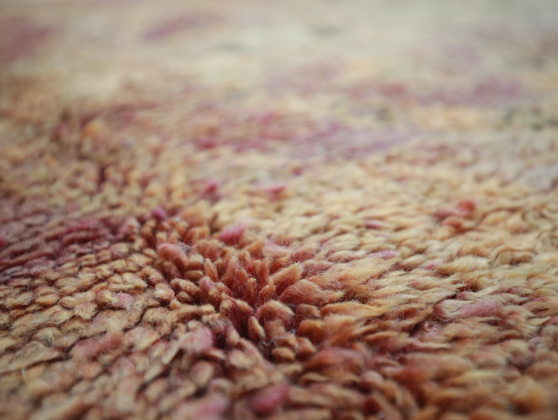 Wool, a sacred material for the Amazigh (Berber) people, forms the cornerstone of Moroccan rug design. Durable, long-lasting, and soft underfoot, wool is both functional and comfortable. In this piece, the wool pile is expertly knotted onto a wool foundation, adding substance and allowing it to gracefully embrace the floor.