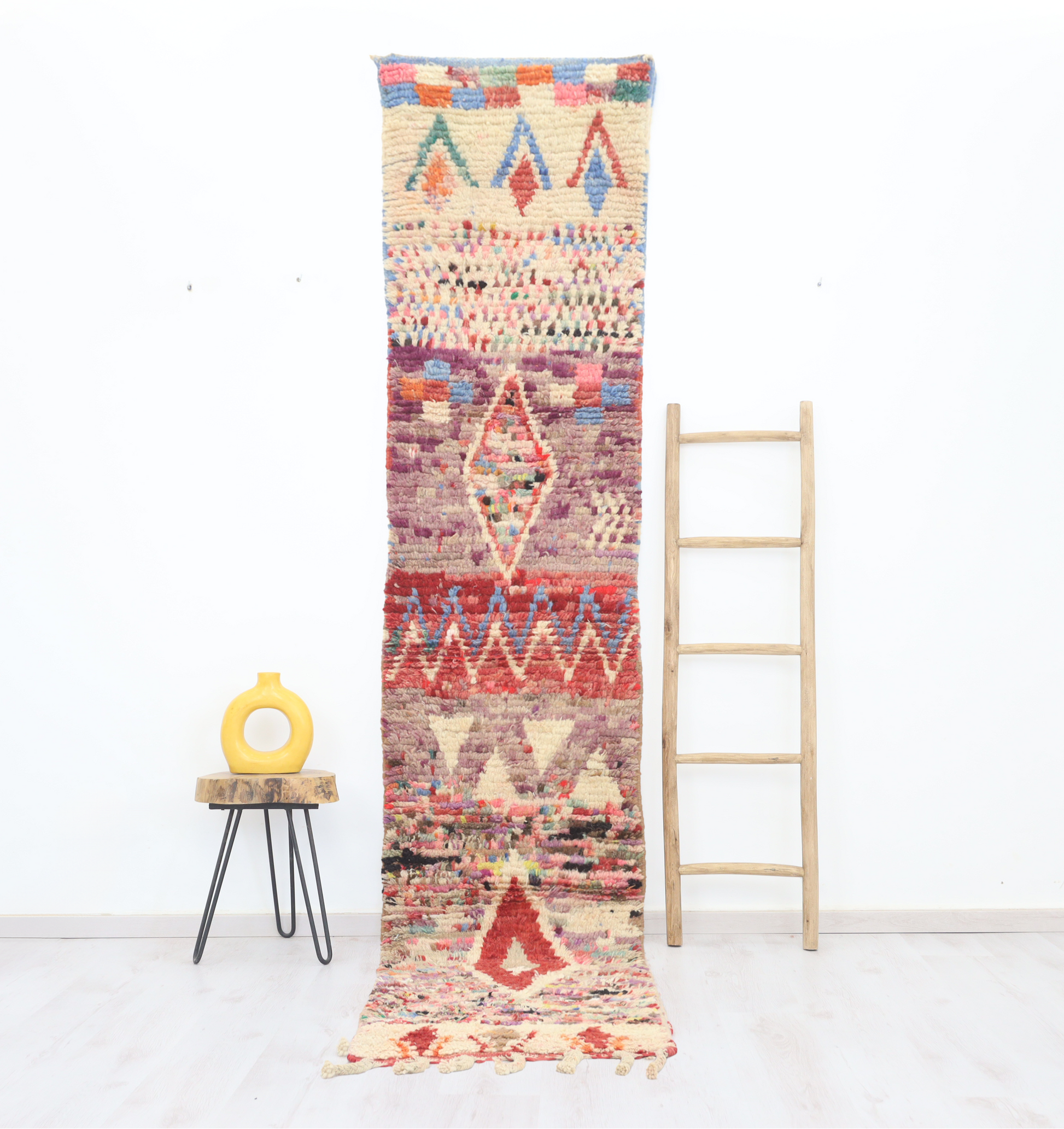 A singular moroccan rug, meticulously woven in the small city of Boujaad in Morocco's Chaouia-Ouardigha region. Size: 2'2" x 10'9" (66 cm x 333 cm).