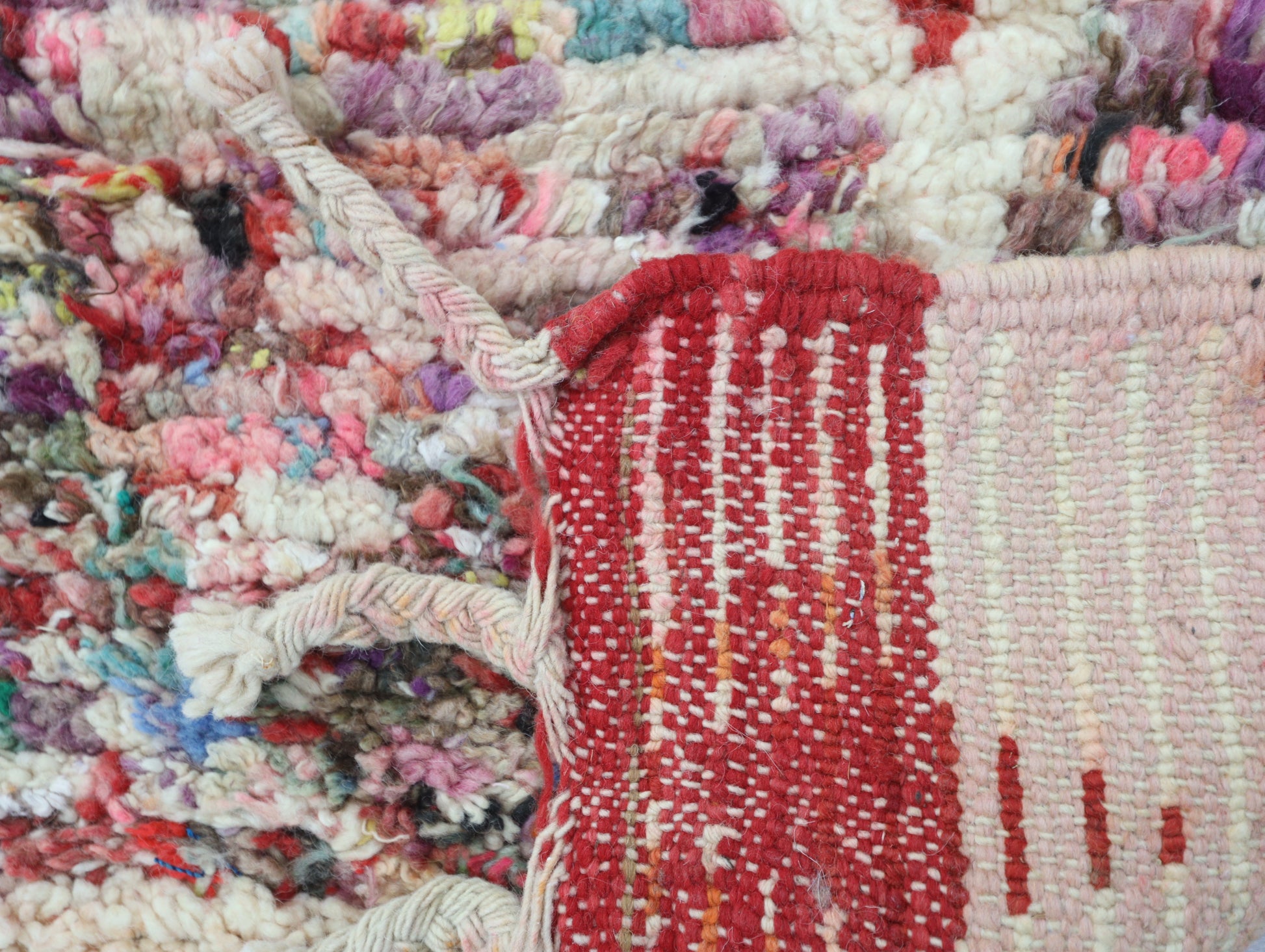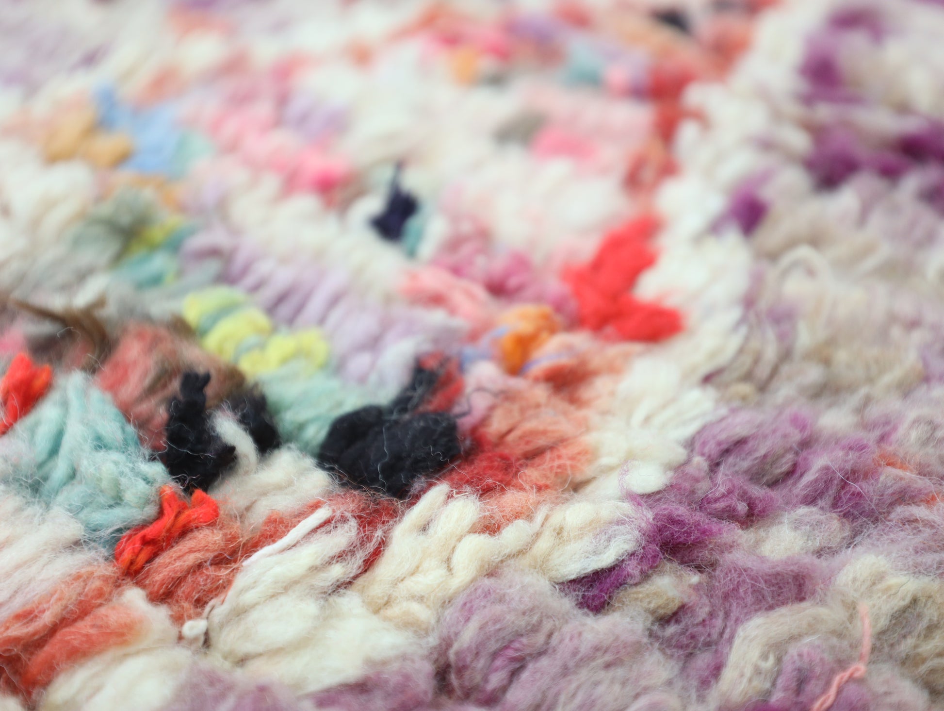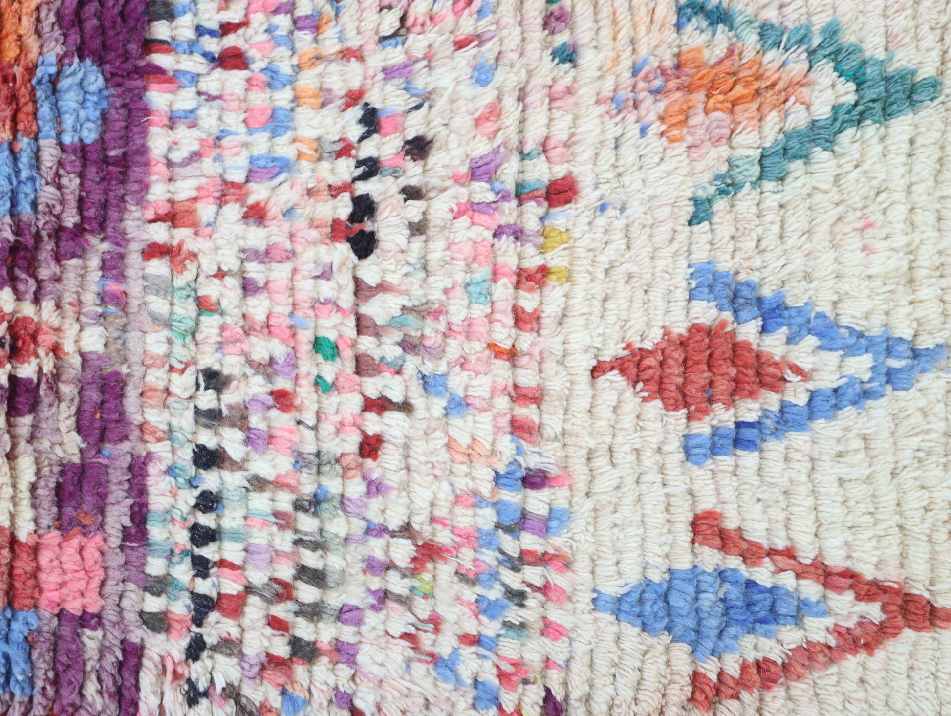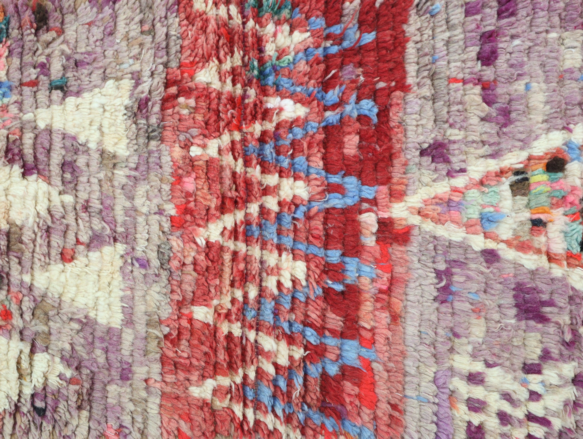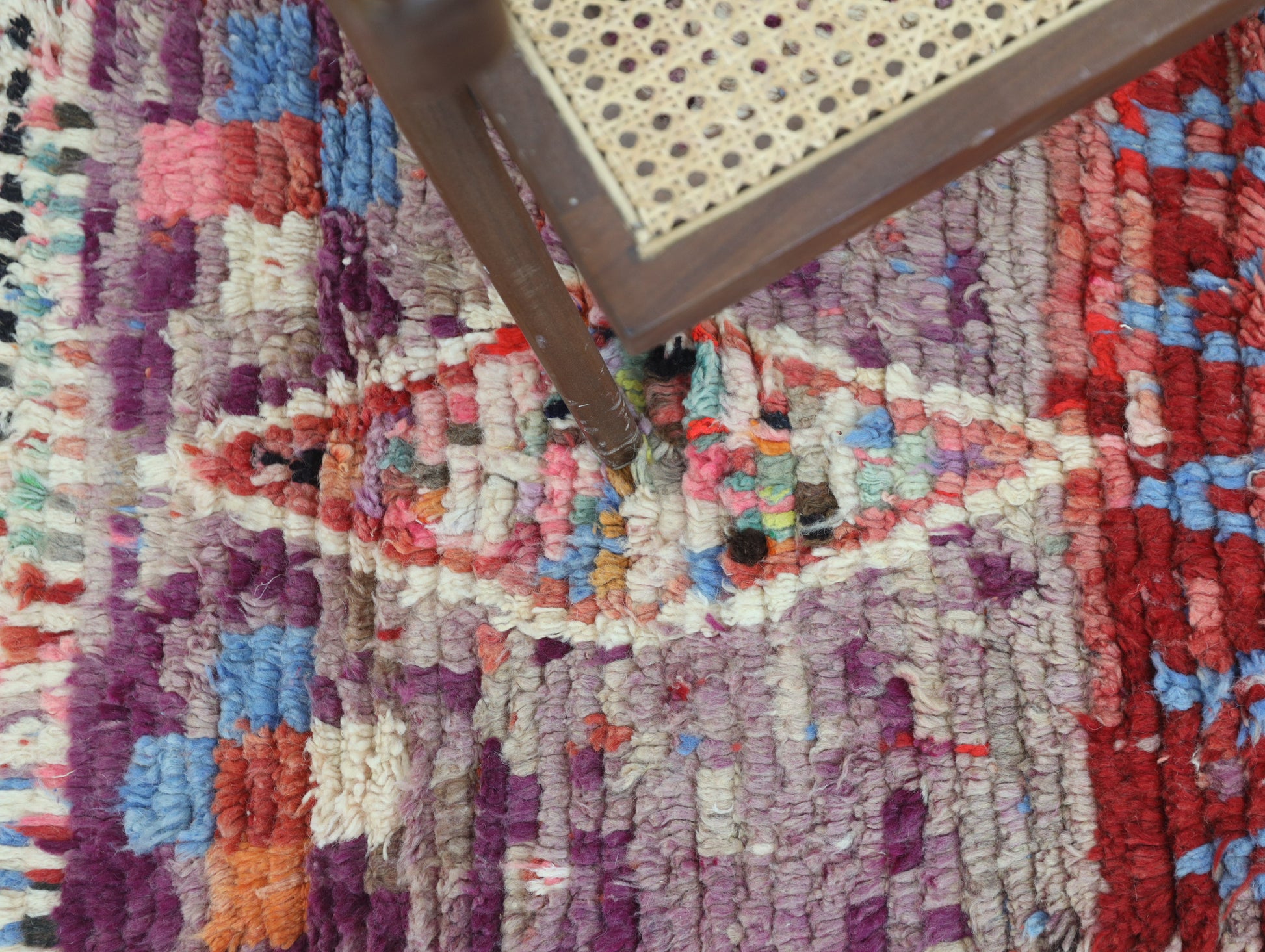 Originating in the Holy town of Boujad, these rugs, woven by diverse tribes, exhibit a wide spectrum of color, composition, and weave. Described as surreal, mystic, and mesmerizing, Boujad rugs transport us to a world beyond reality. Their construction, with twice as many horizontal as vertical knots, renders them floppy and easy to move.