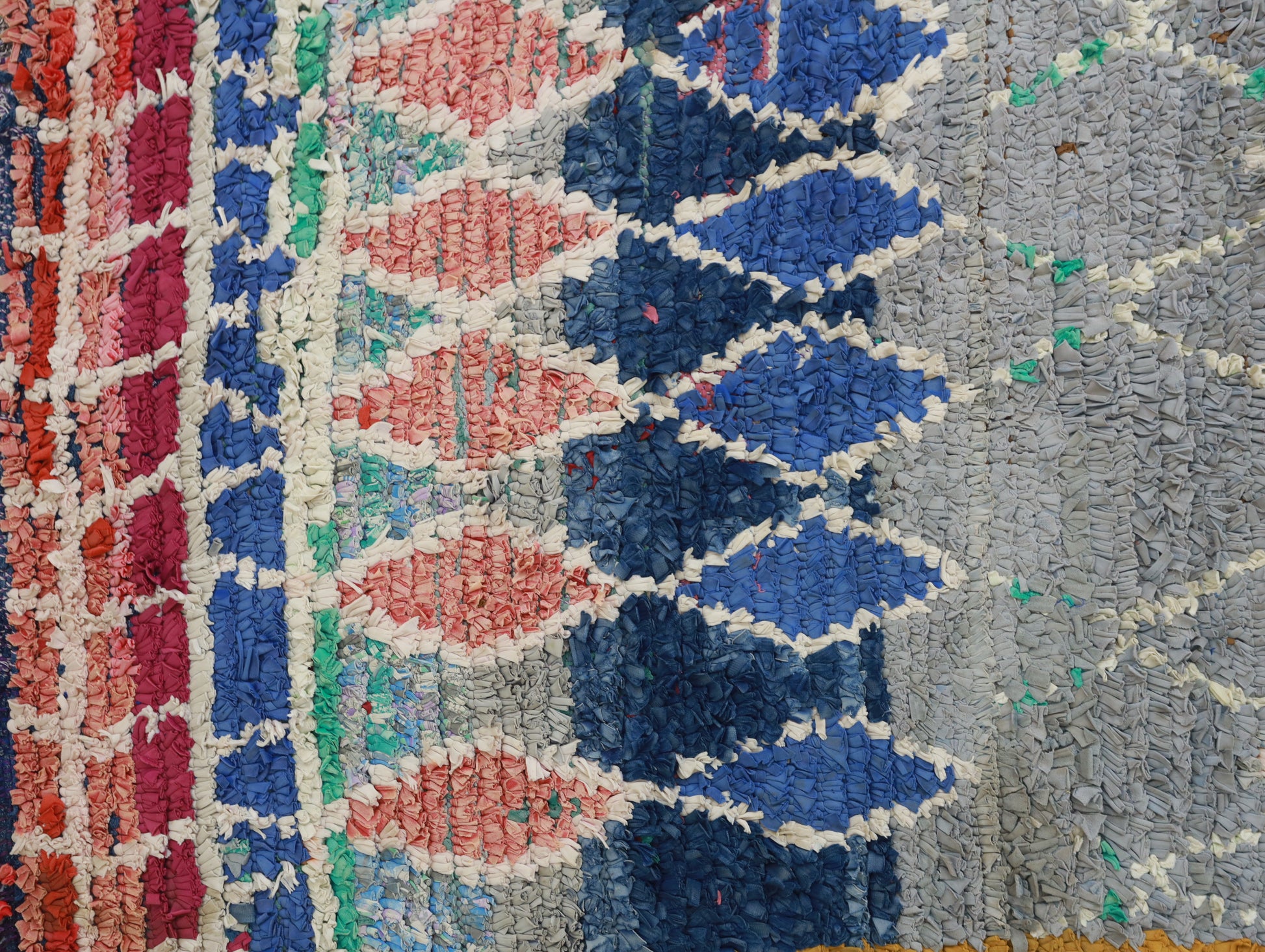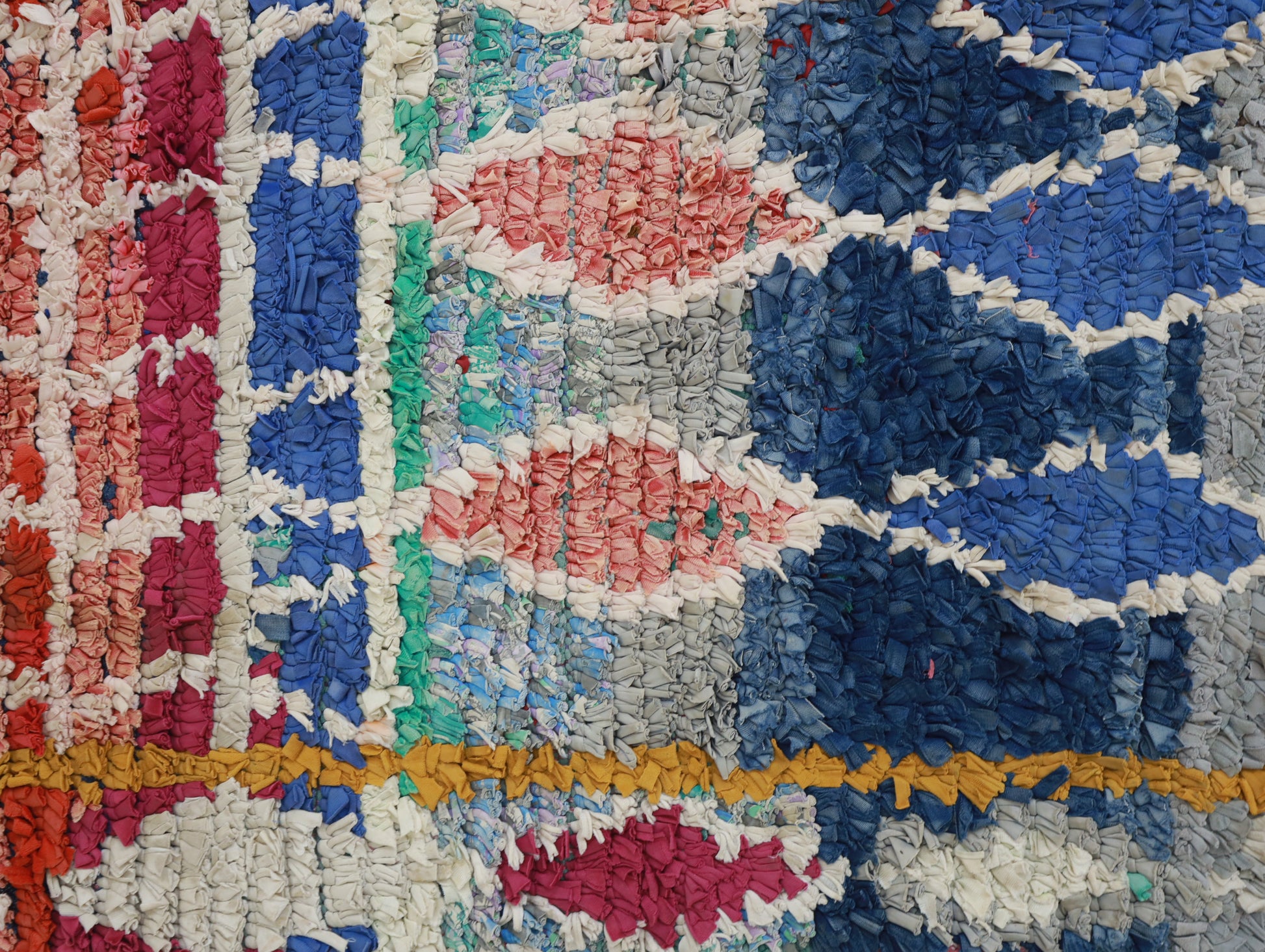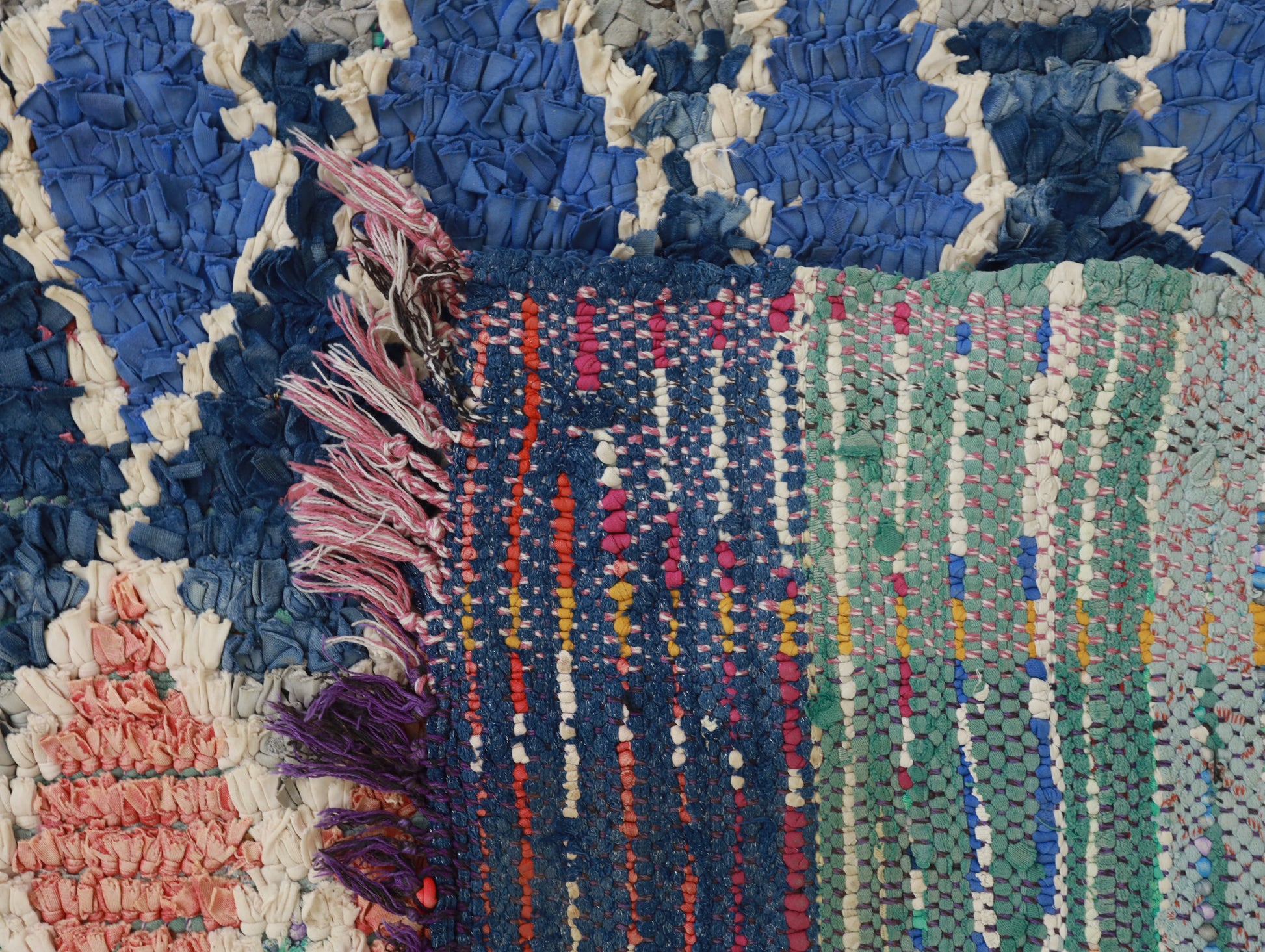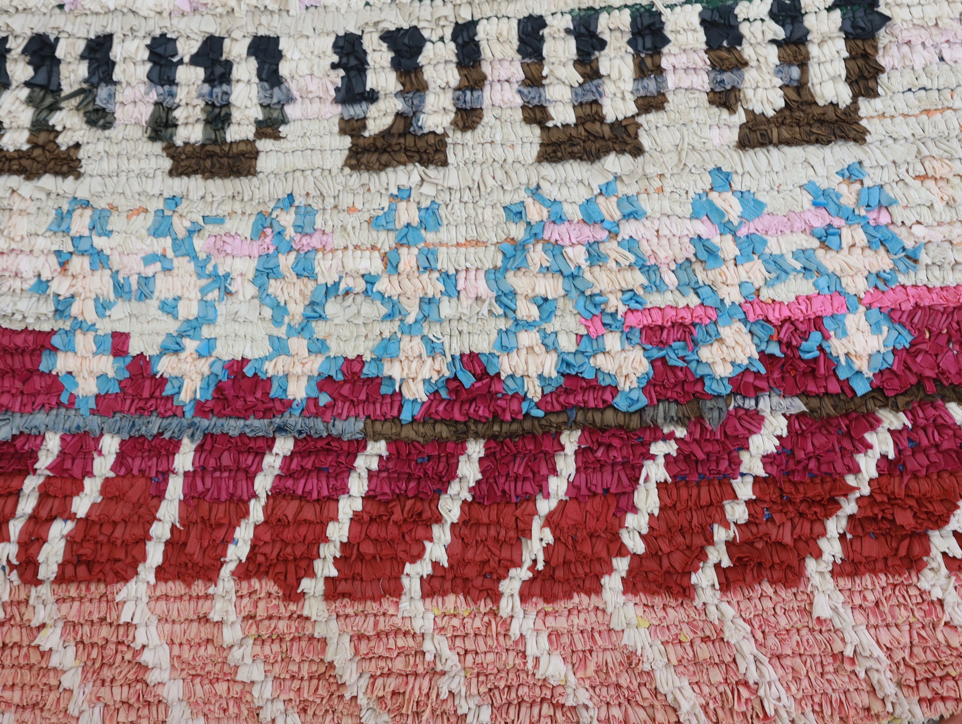 An unparalleled vintage masterpiece, carefully crafted by Berber Tribes in the Boucherouite style using upcycled textiles. Measurements: 3'6" x 6'7" (110 cm x 204 cm),