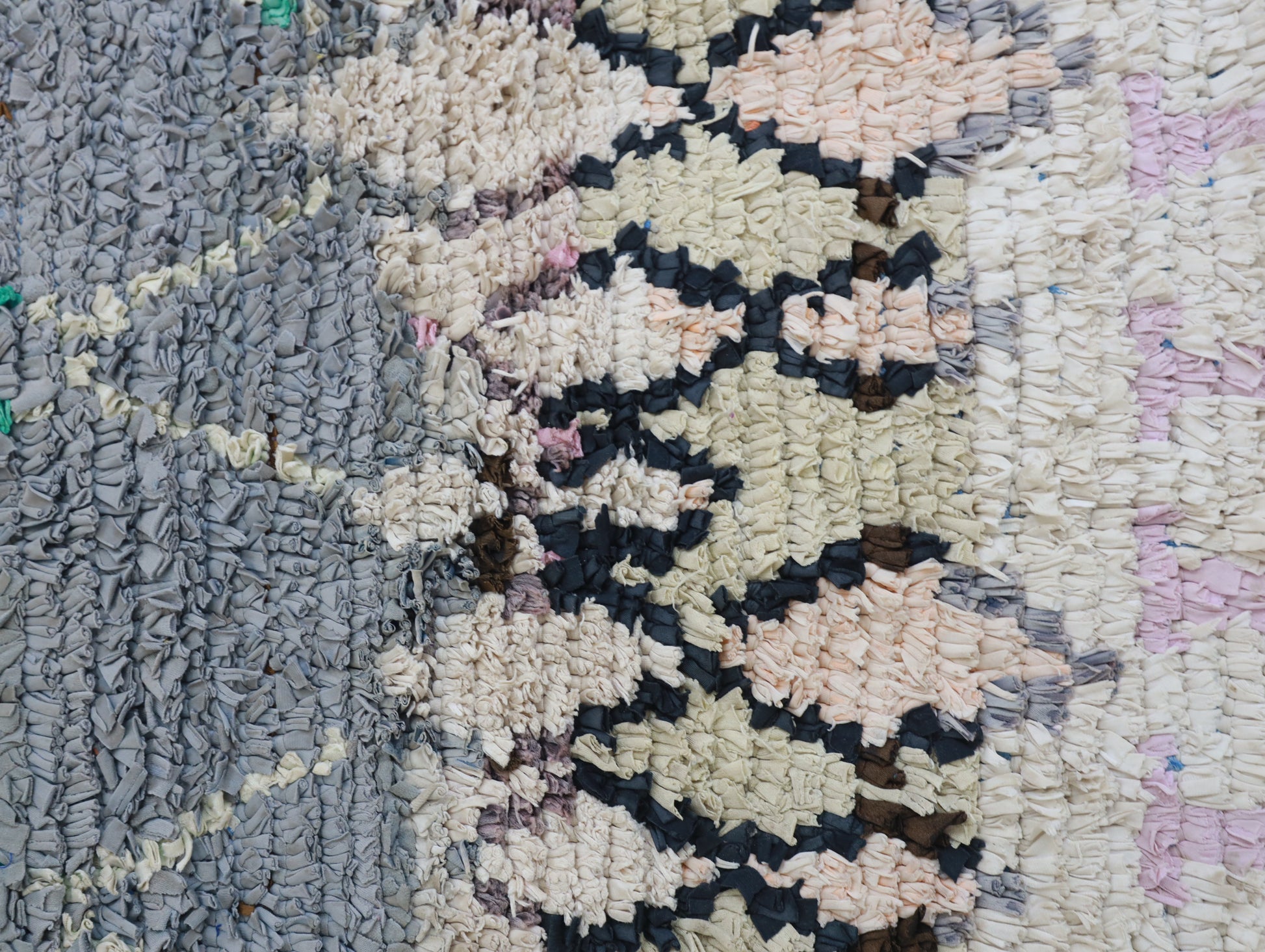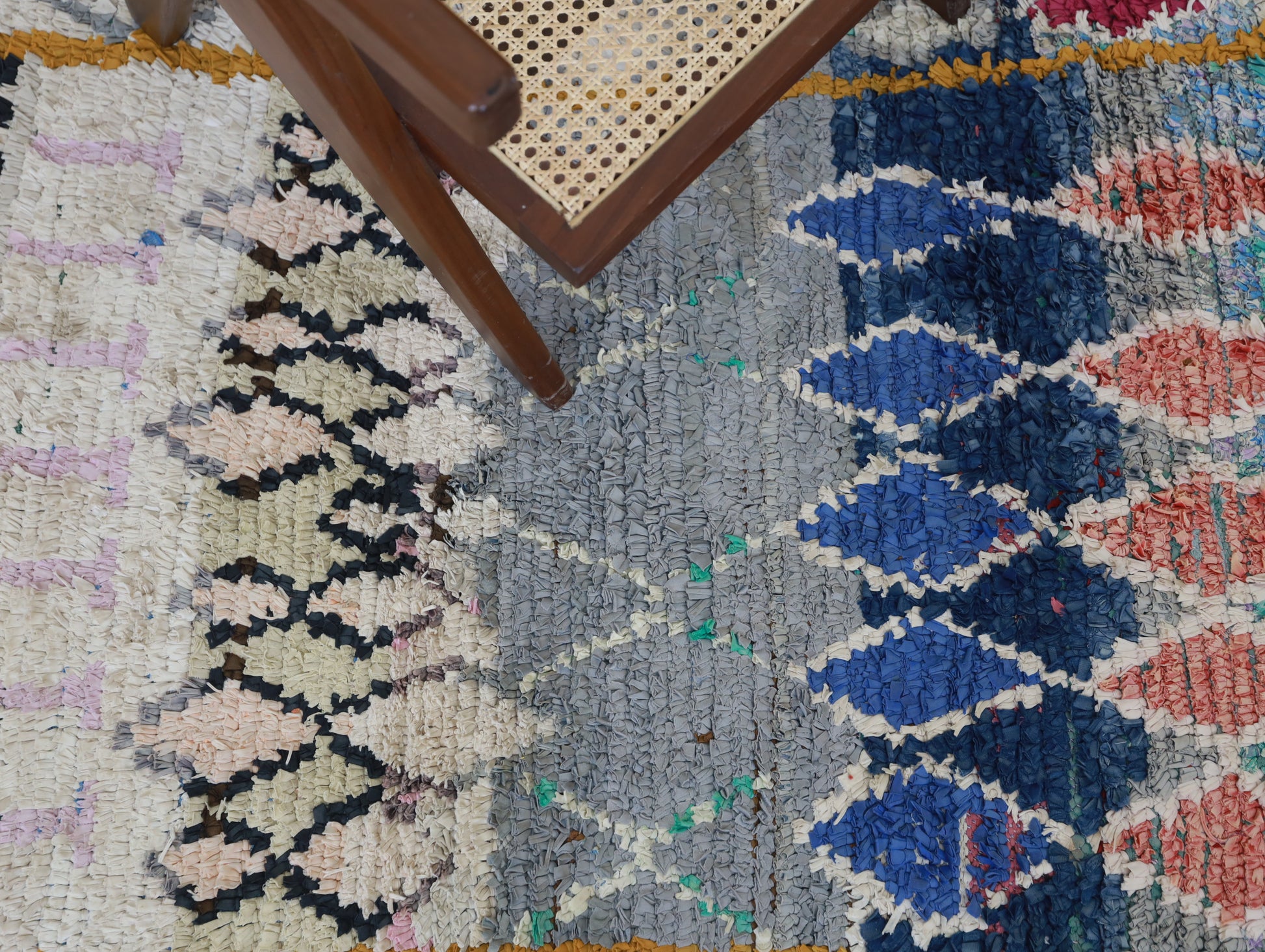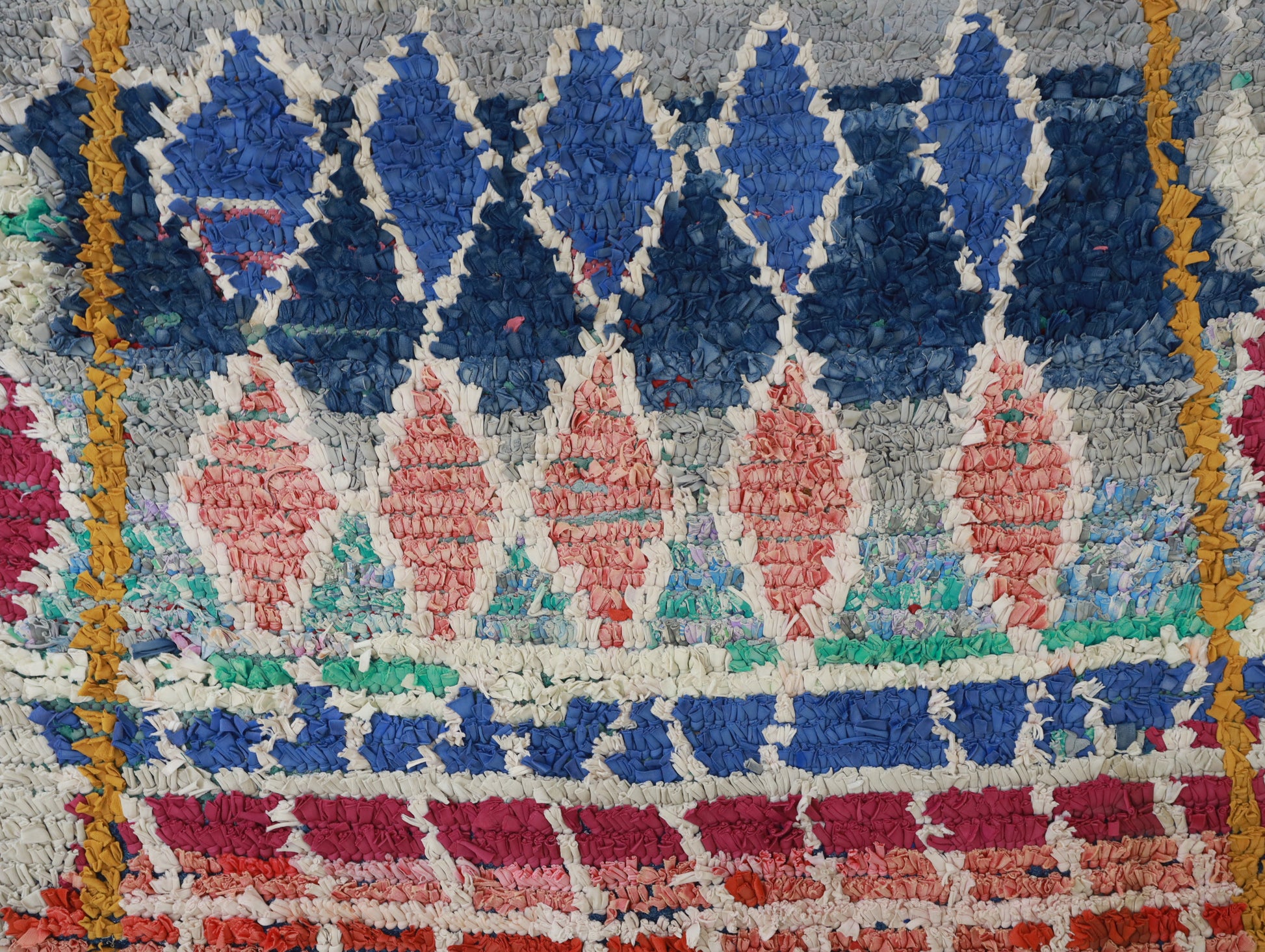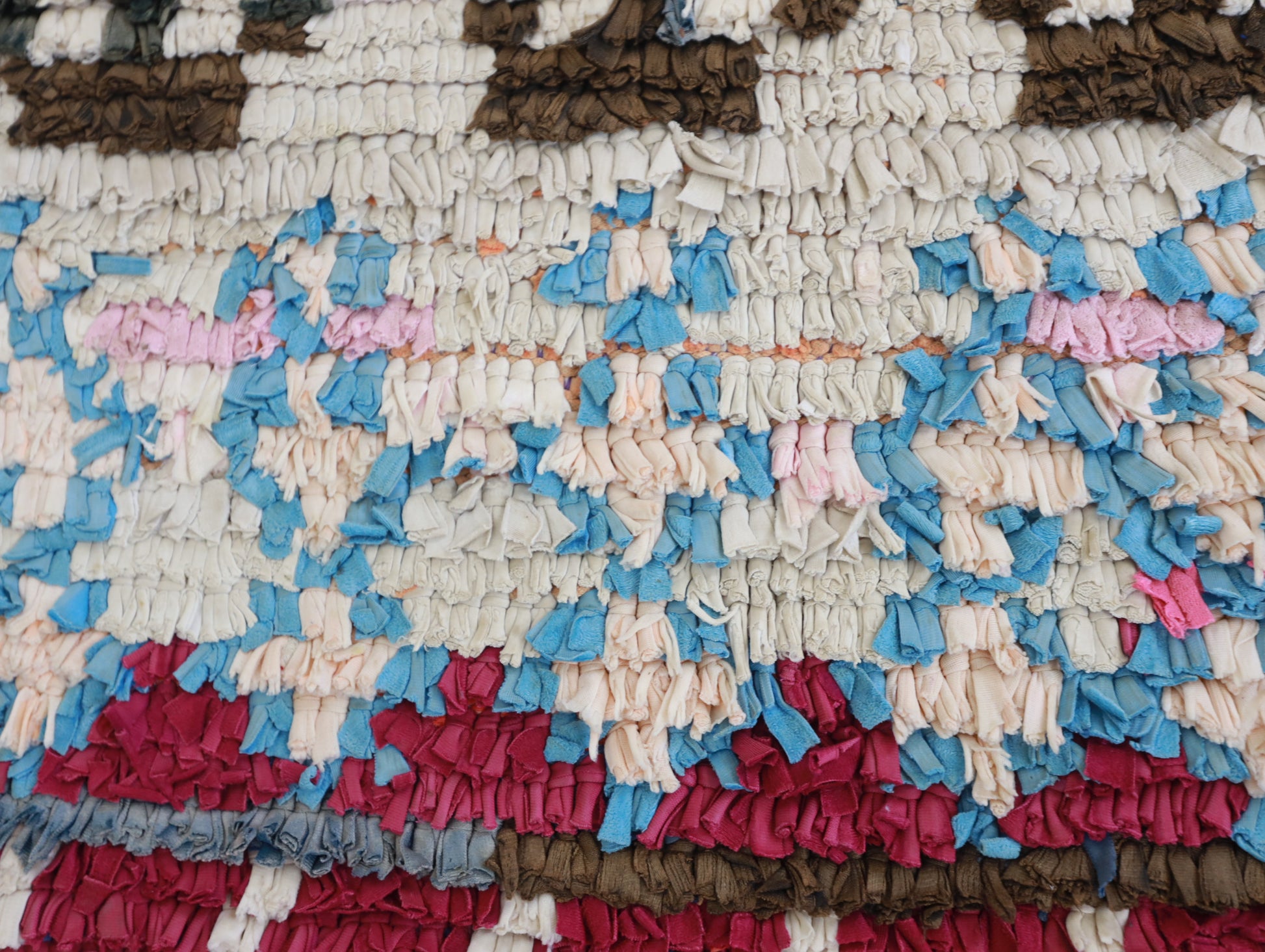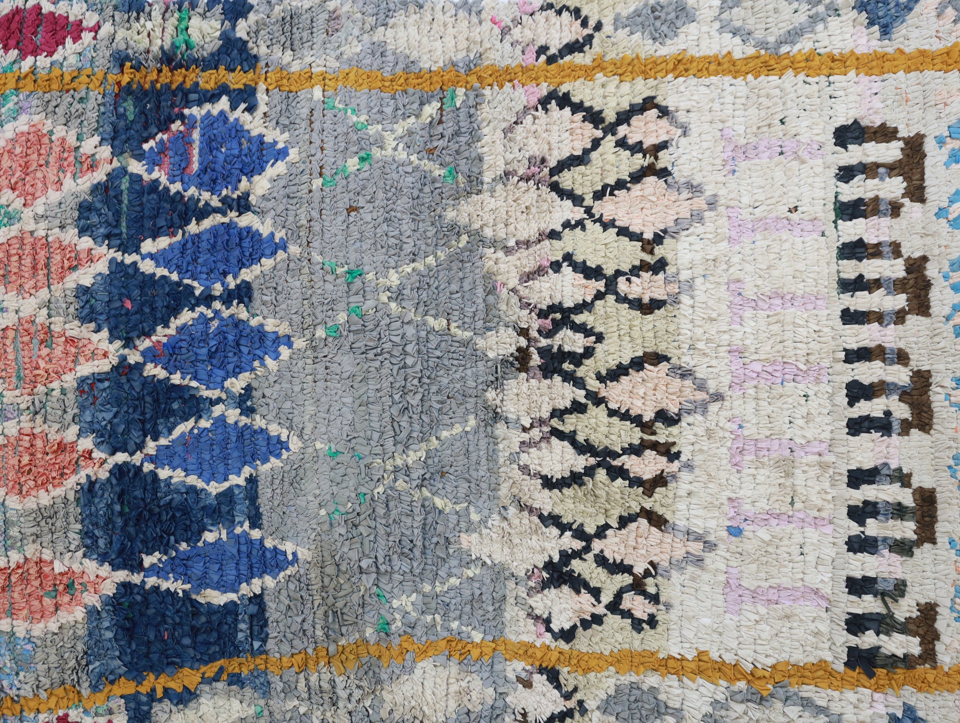 An unparalleled vintage masterpiece, carefully crafted by Berber Tribes in the Boucherouite style using upcycled textiles. Measurements: 3'6" x 6'7" (110 cm x 204 cm),