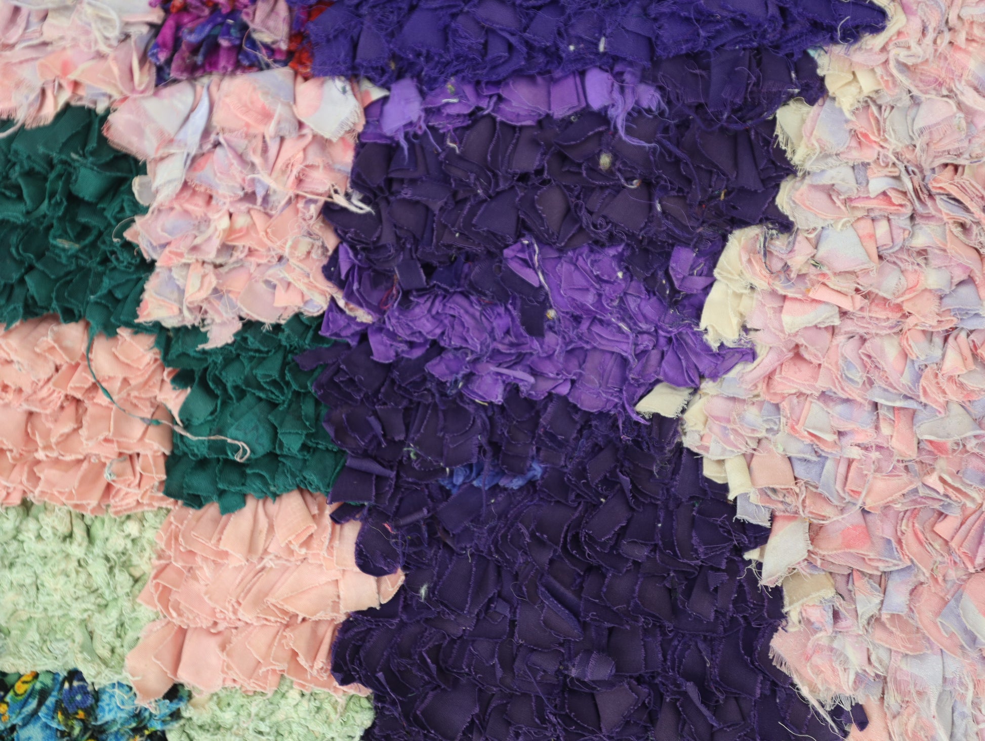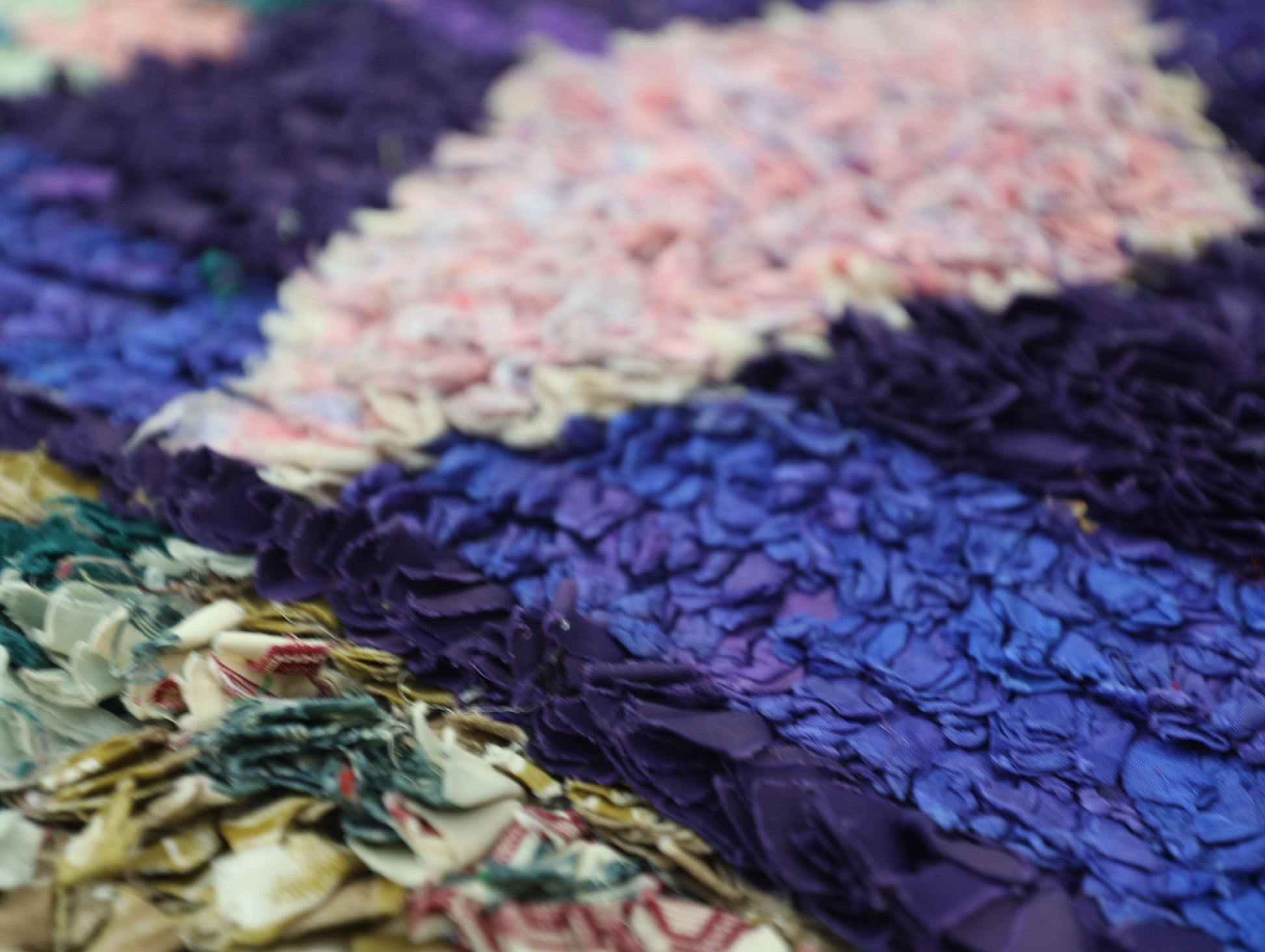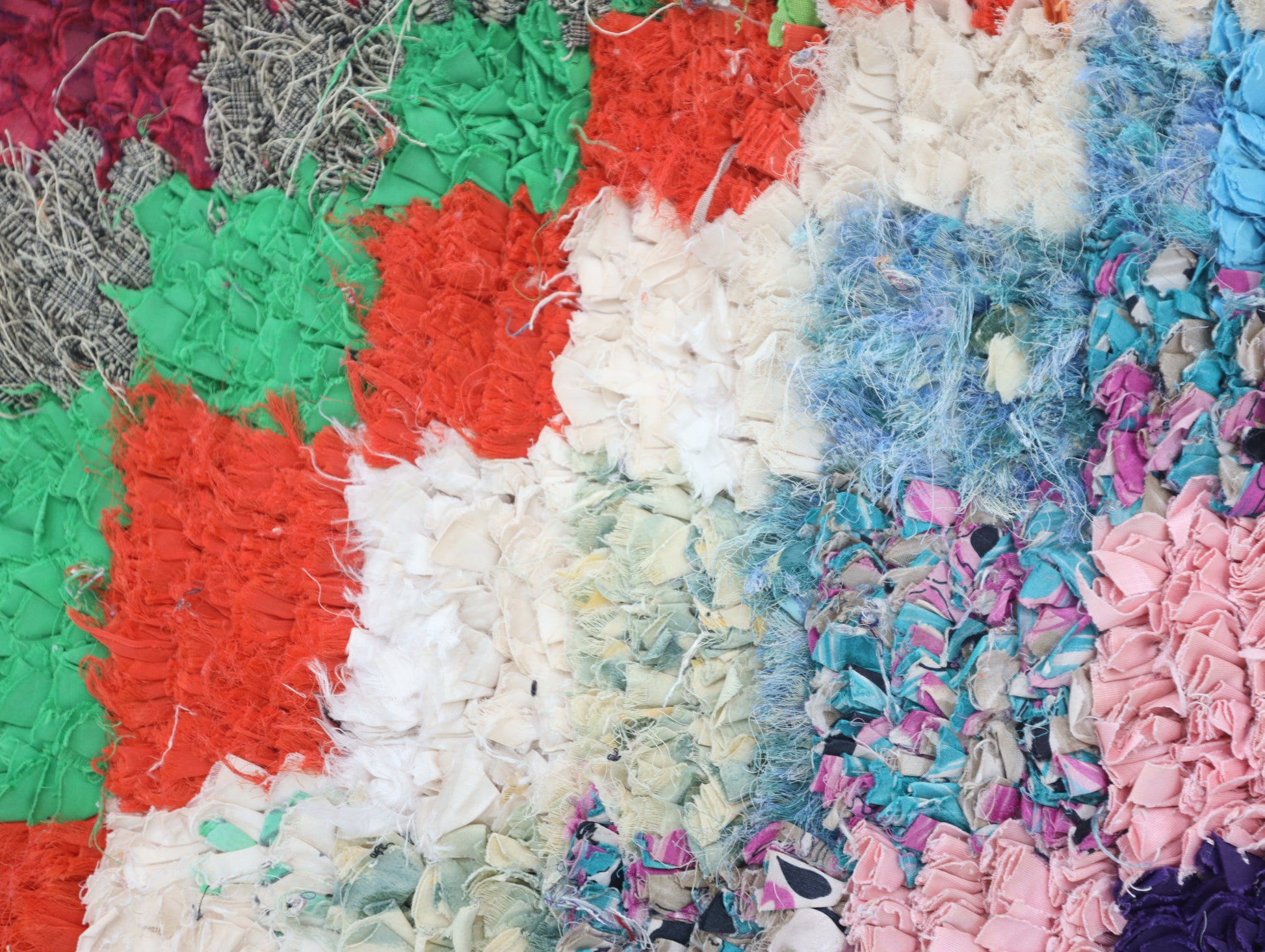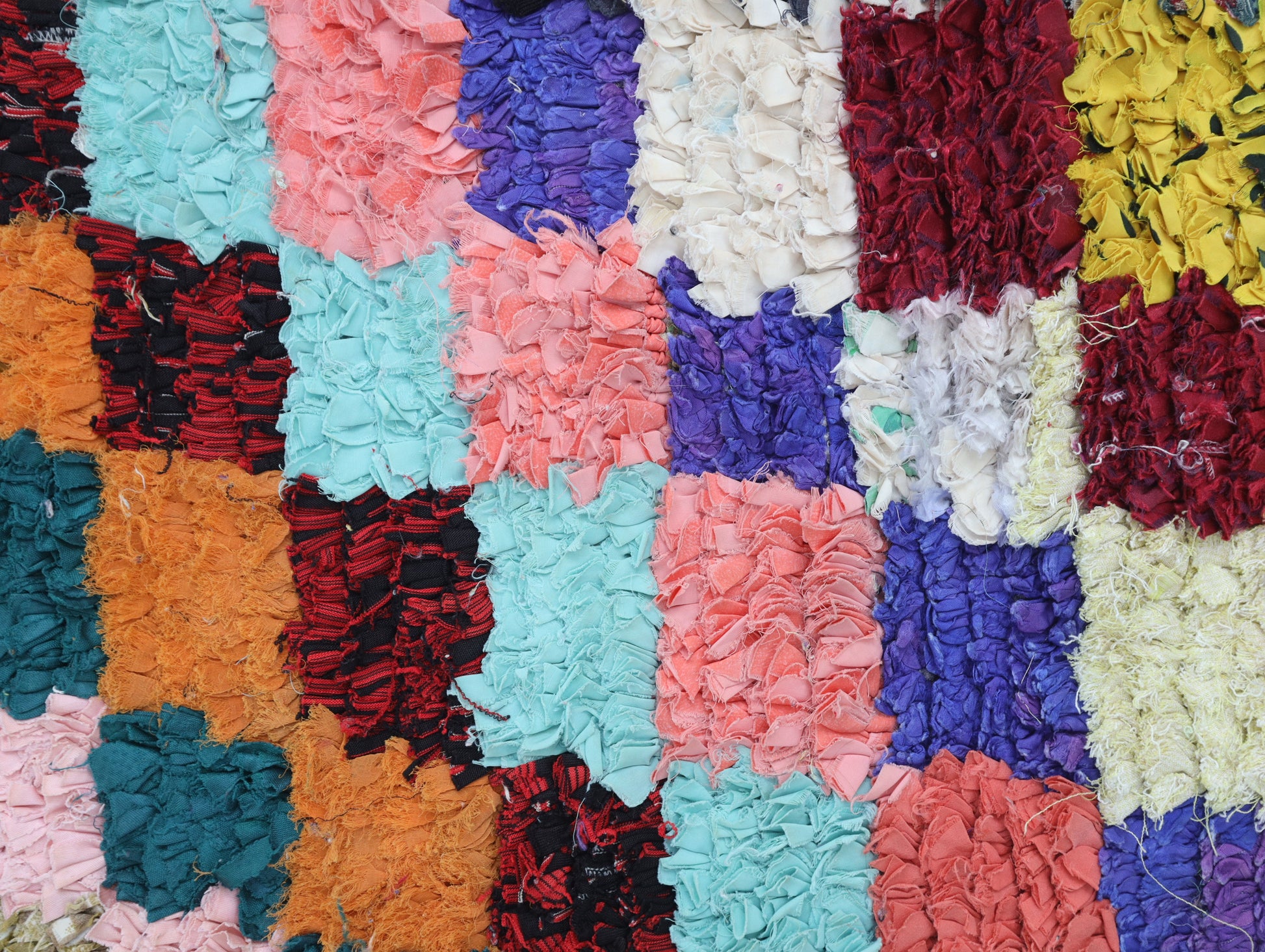 An unparalleled vintage masterpiece, carefully crafted by Berber Tribes in the Boucherouite style using upcycled textiles. Measurements: 4'2" x 7'2" (127 cm x 220 cm),