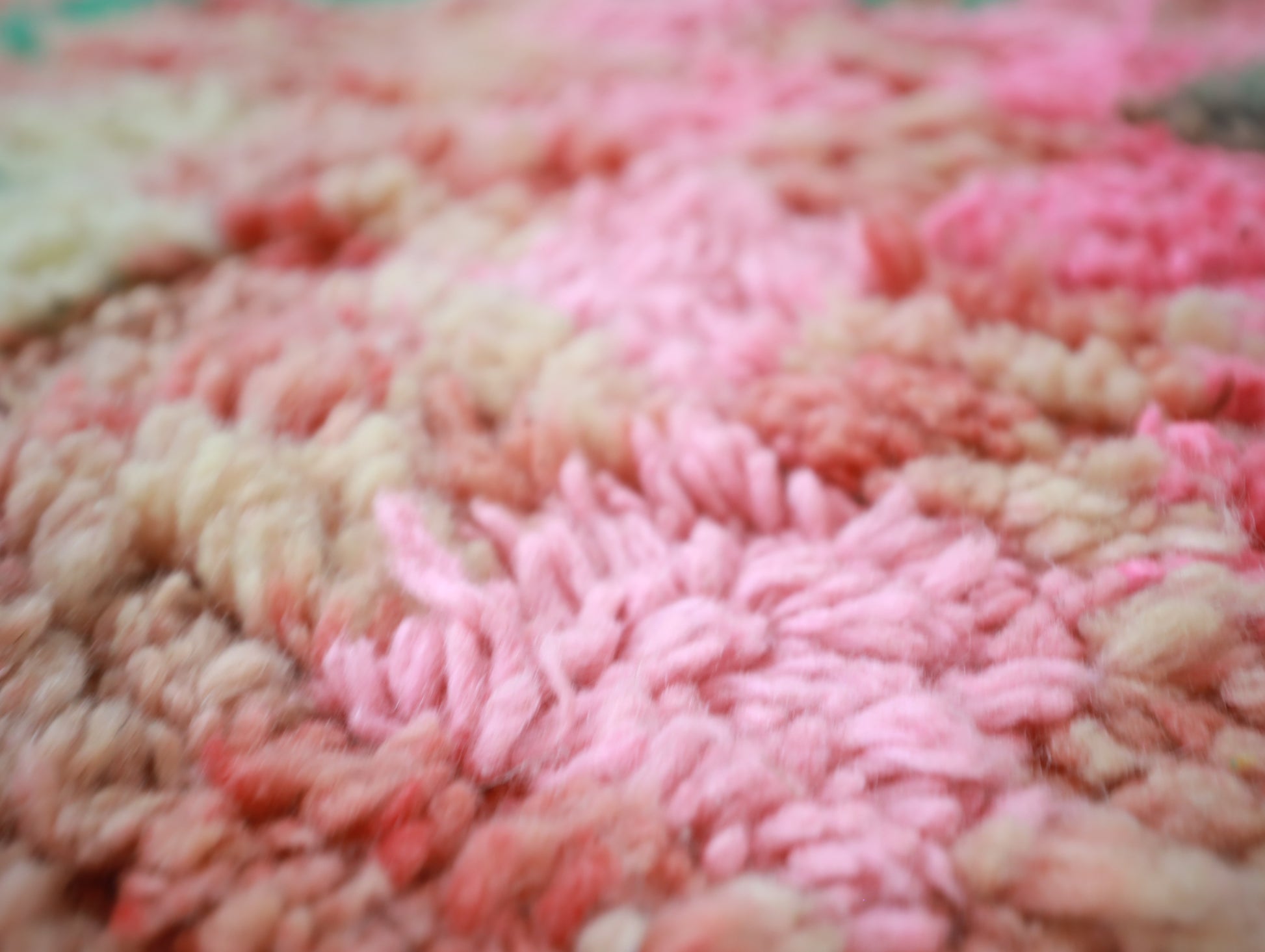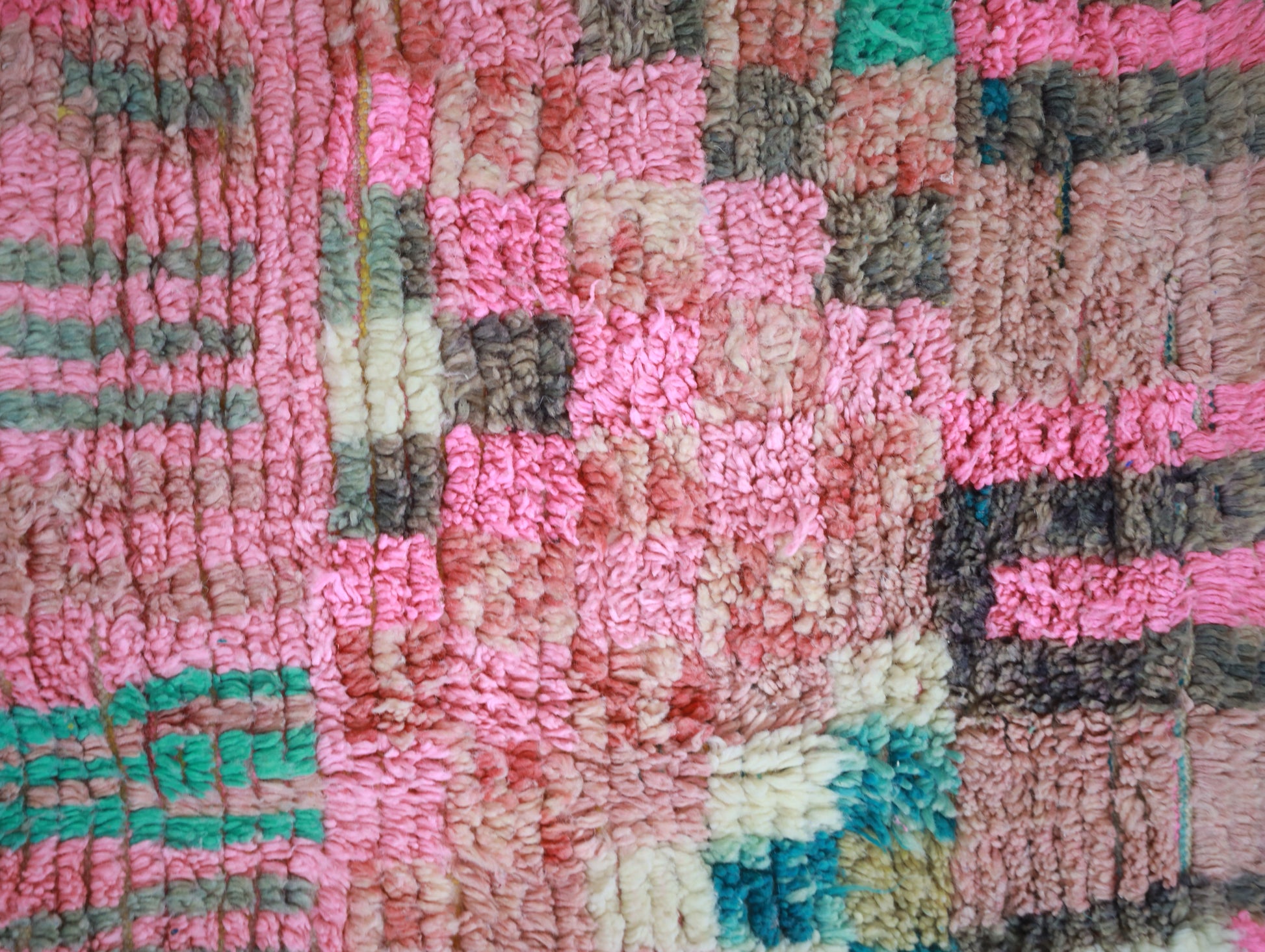 Originating in the Holy town of Boujad, these rugs, woven by diverse tribes, exhibit a wide spectrum of color, composition, and weave. Described as surreal, mystic, and mesmerizing, Boujad rugs transport us to a world beyond reality. Their construction, with twice as many horizontal as vertical knots, renders them floppy and easy to move.