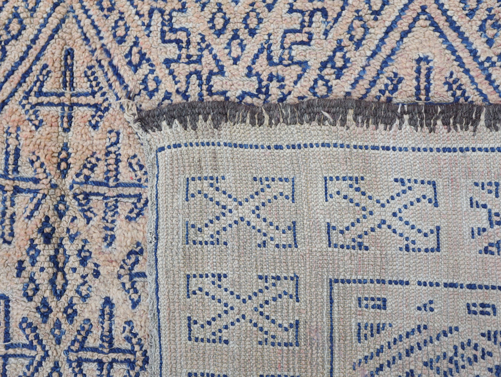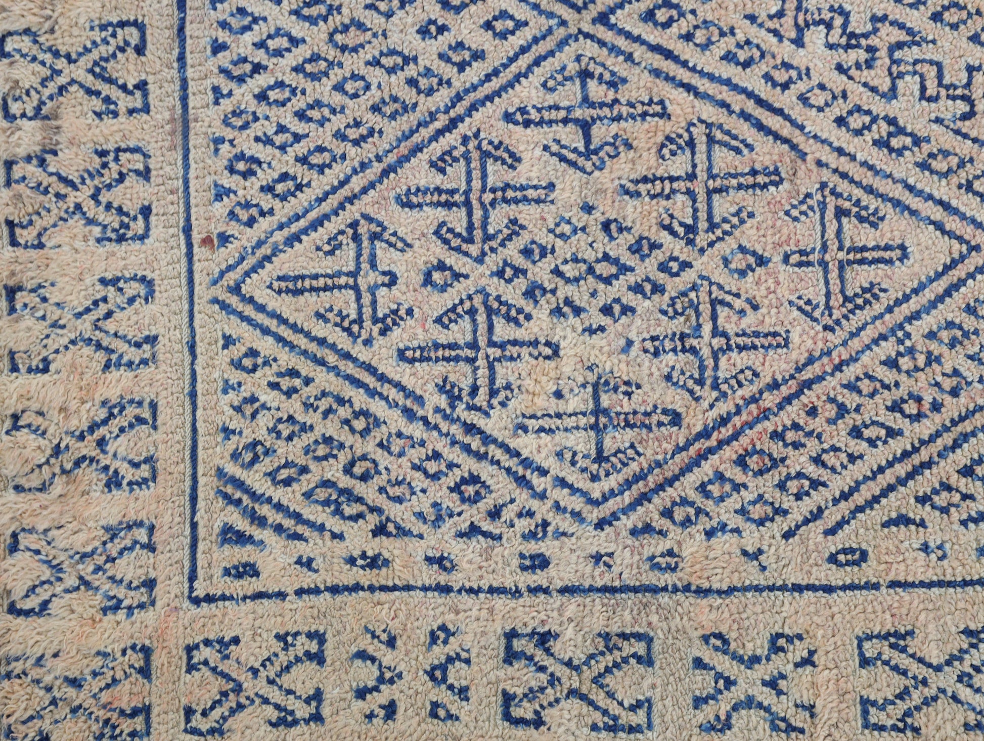 Wool, a sacred material for the Amazigh (Berber) people, forms the cornerstone of Moroccan rug design. Durable, long-lasting, and soft underfoot, wool is both functional and comfortable. In this piece, the wool pile is expertly knotted onto a wool foundation, adding substance and allowing it to gracefully embrace the floor.