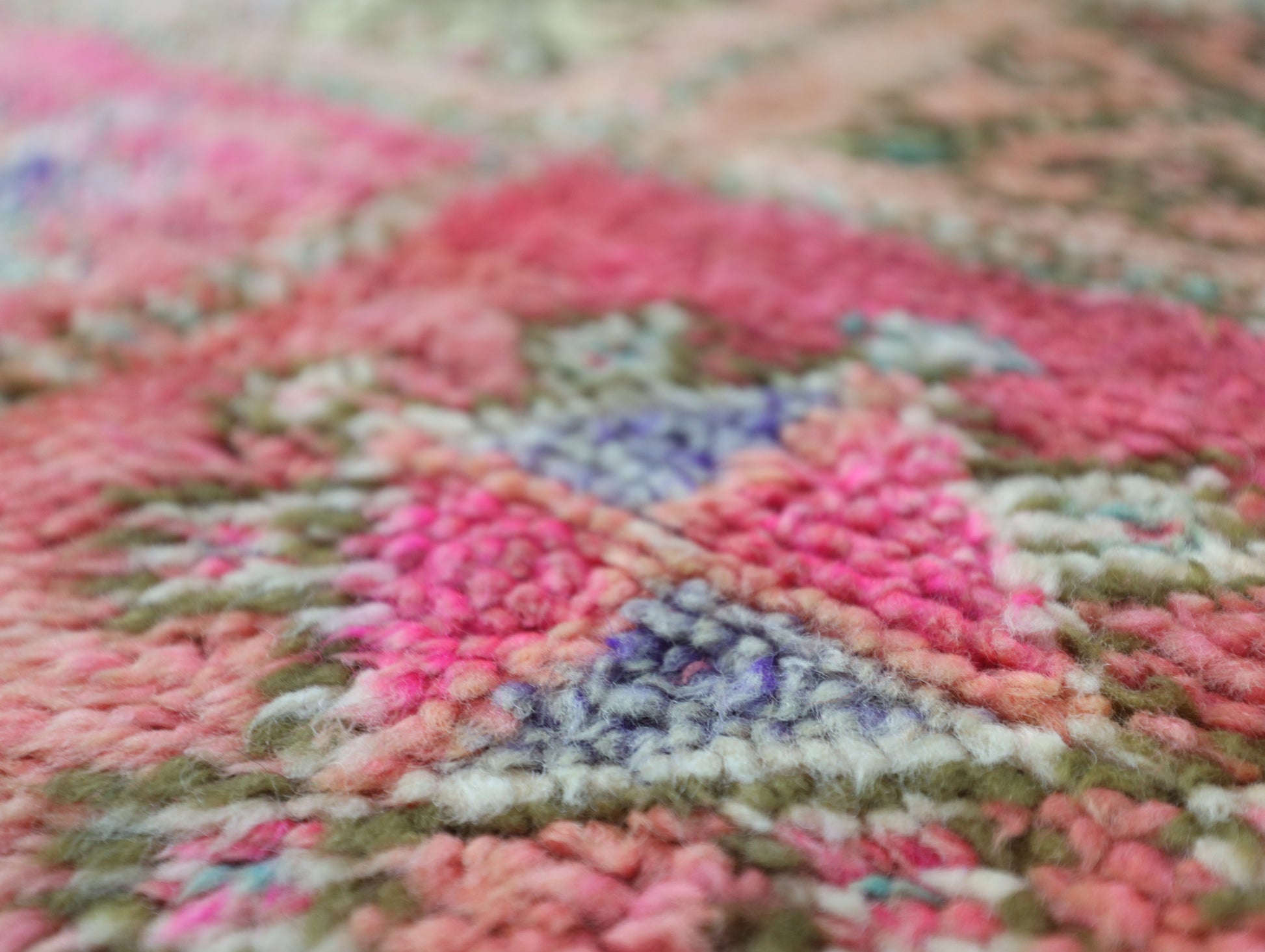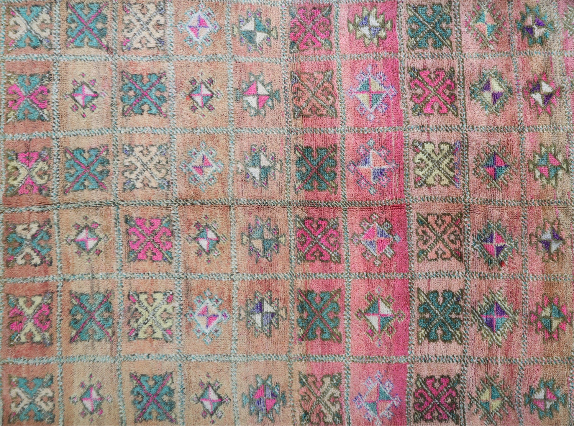 Originating in the Holy town of Boujad, these rugs, woven by diverse tribes, exhibit a wide spectrum of color, composition, and weave. Described as surreal, mystic, and mesmerizing, Boujad rugs transport us to a world beyond reality. Their construction, with twice as many horizontal as vertical knots, renders them floppy and easy to move.