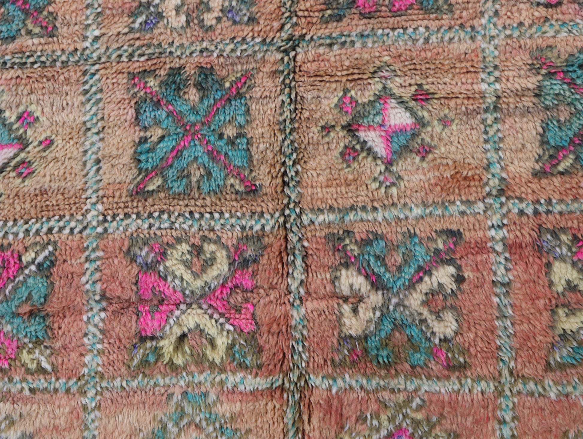 Wool, a sacred material for the Amazigh (Berber) people, forms the cornerstone of Moroccan rug design. Durable, long-lasting, and soft underfoot, wool is both functional and comfortable. In this piece, the wool pile is expertly knotted onto a wool foundation, adding substance and allowing it to gracefully embrace the floor.