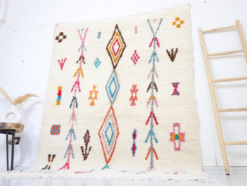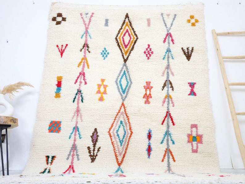 Azilal rugs boast abstract, painterly designs reminiscent of rugs from Ourika. What sets them apart is a vibrant color palette, achieved through the incorporation of cotton alongside wool.