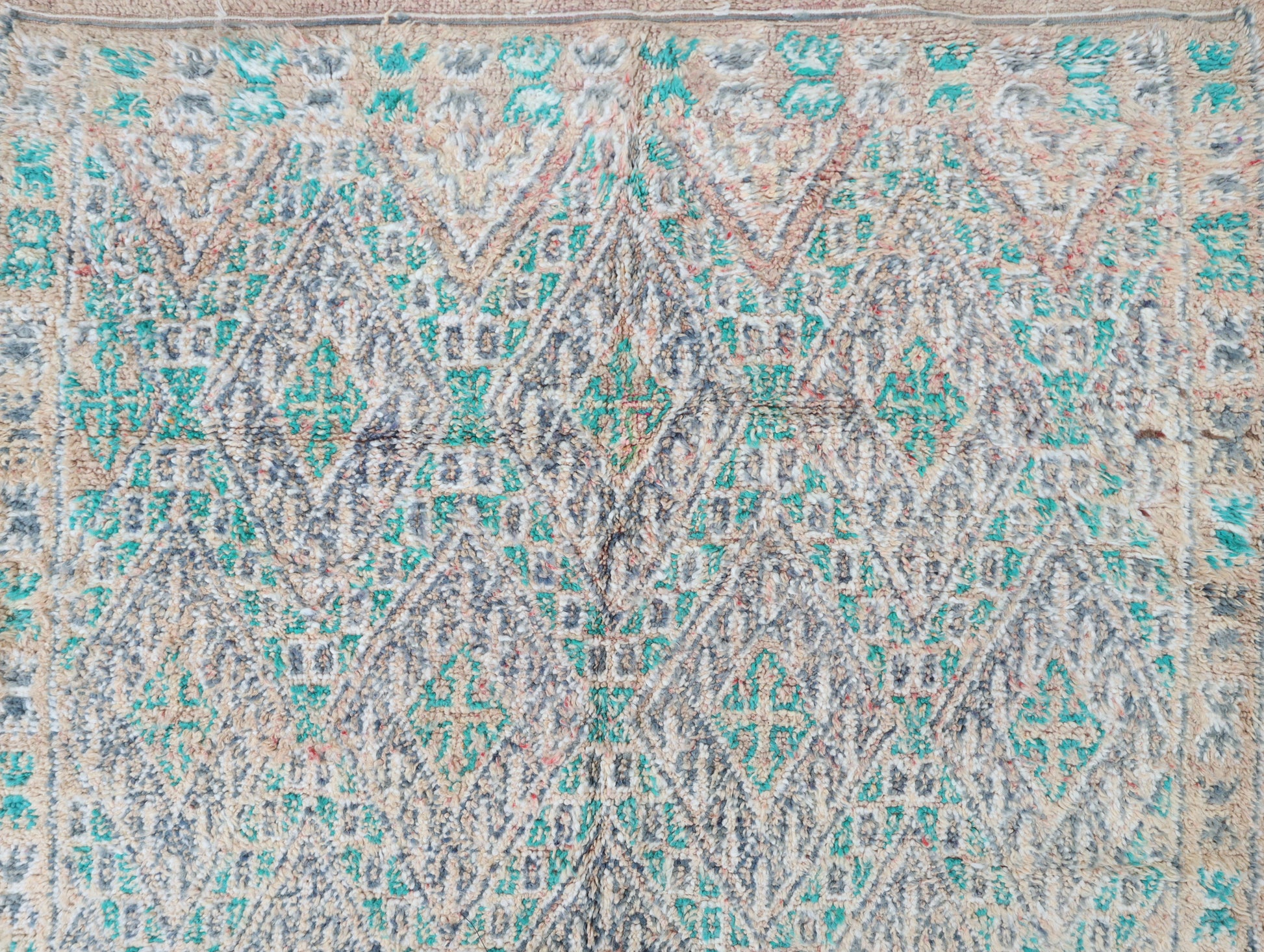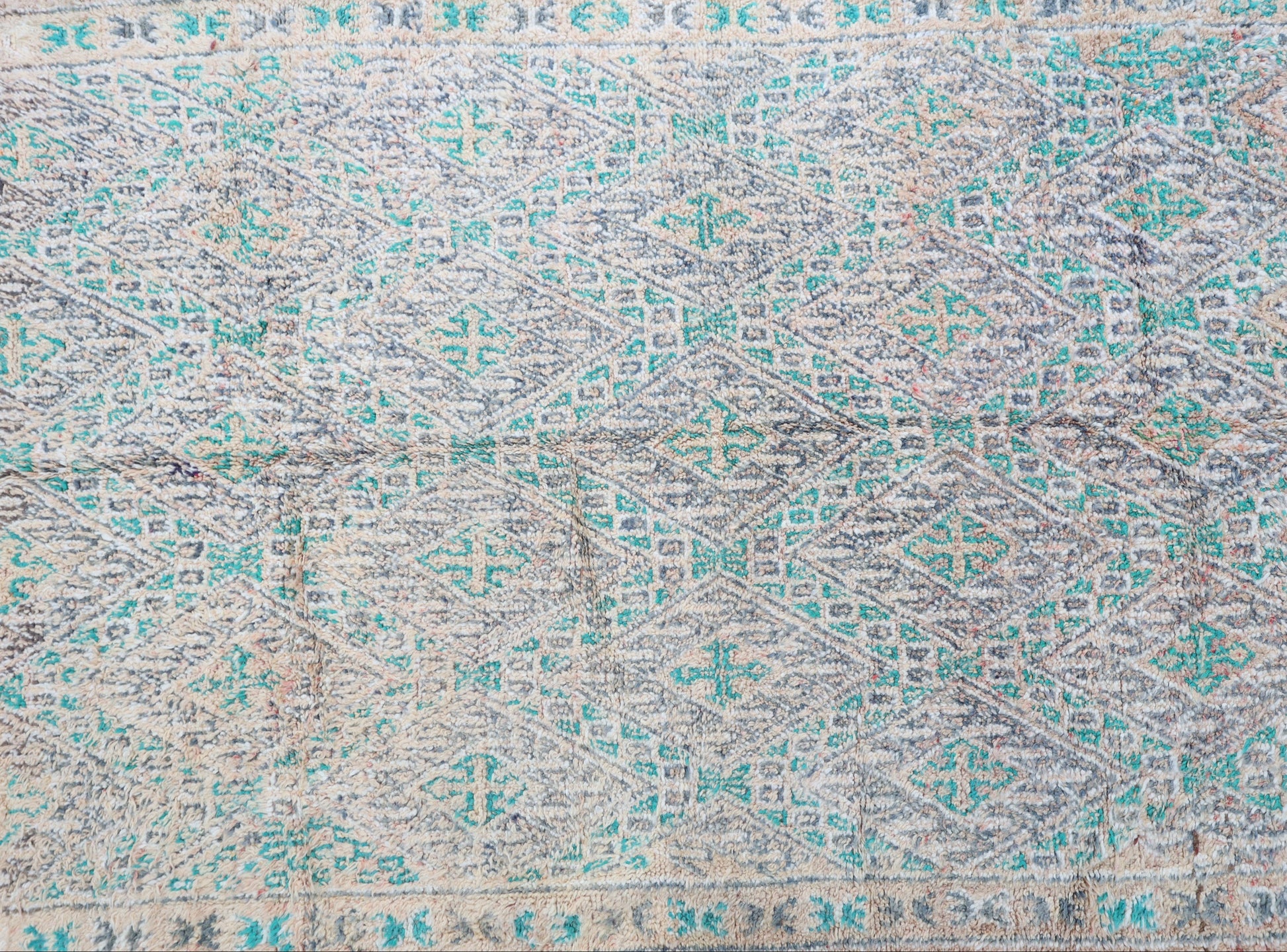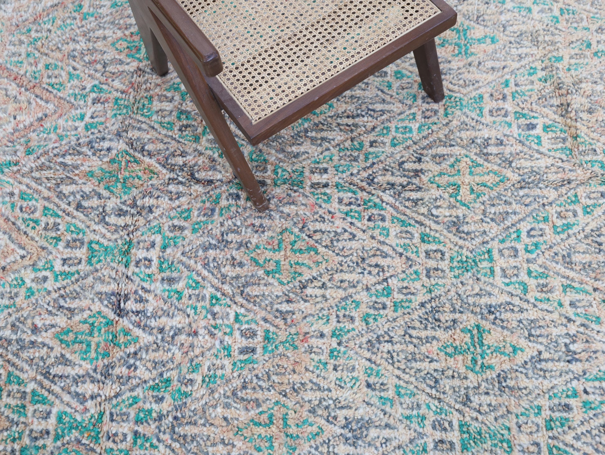 Wool, a sacred material for the Amazigh (Berber) people, forms the cornerstone of Moroccan rug design. Durable, long-lasting, and soft underfoot, wool is both functional and comfortable. In this piece, the wool pile is expertly knotted onto a wool foundation, adding substance and allowing it to gracefully embrace the floor.