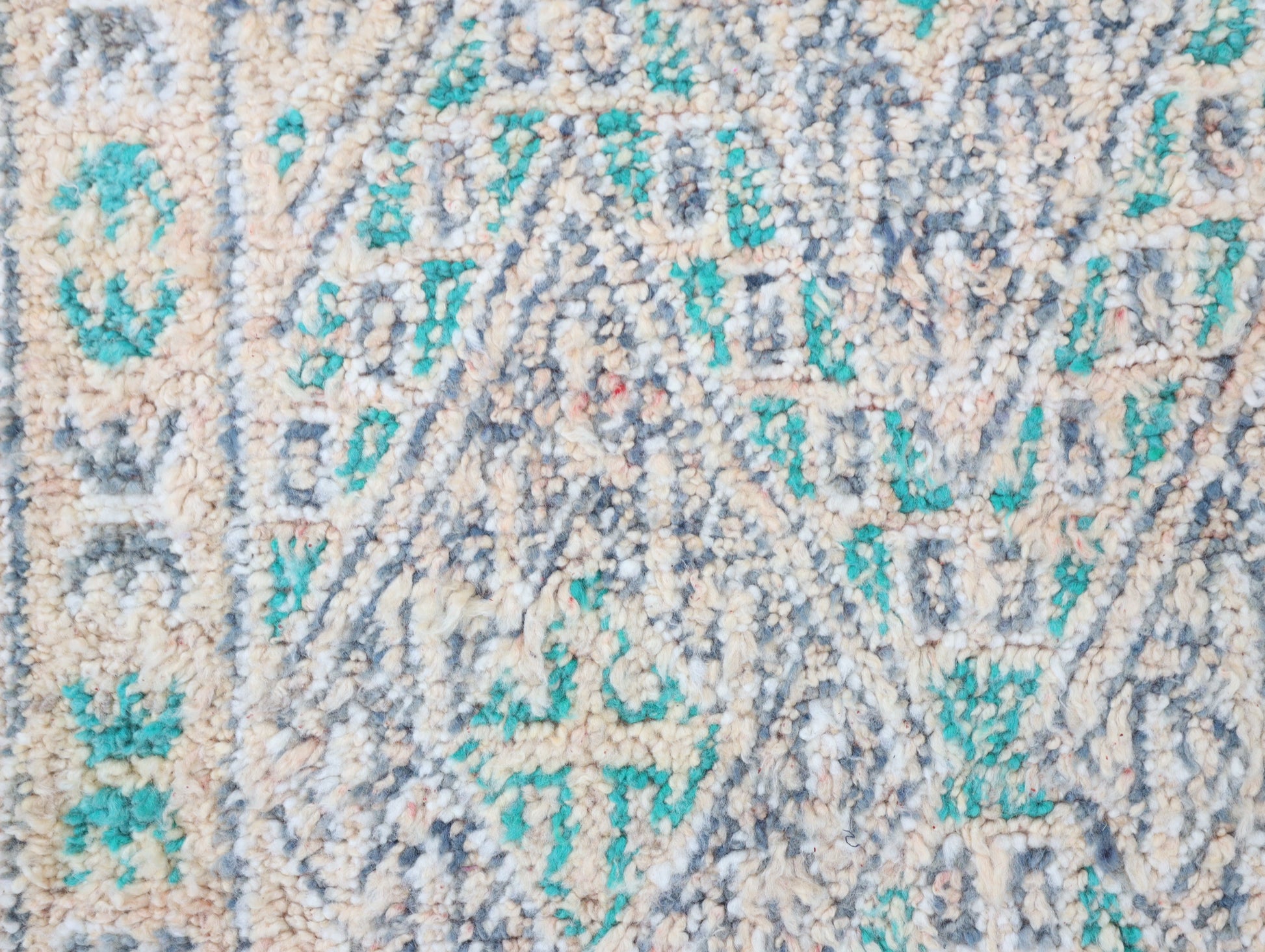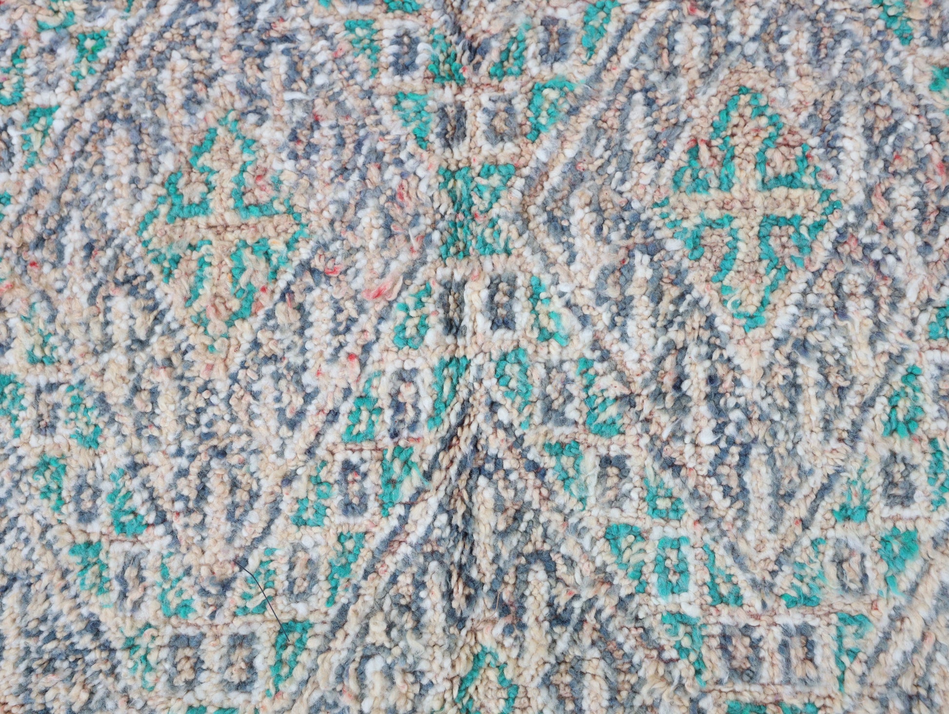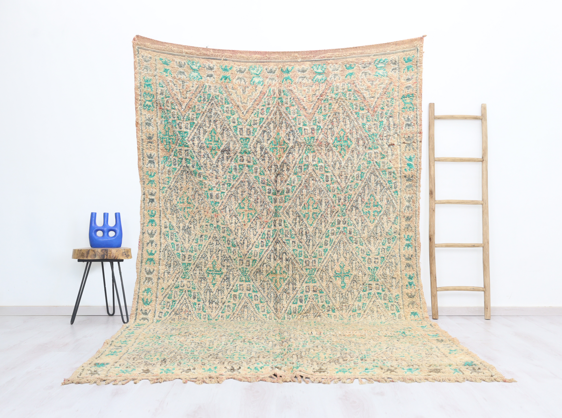 Wool, a sacred material for the Amazigh (Berber) people, forms the cornerstone of Moroccan rug design. Durable, long-lasting, and soft underfoot, wool is both functional and comfortable. In this piece, the wool pile is expertly knotted onto a wool foundation, adding substance and allowing it to gracefully embrace the floor.