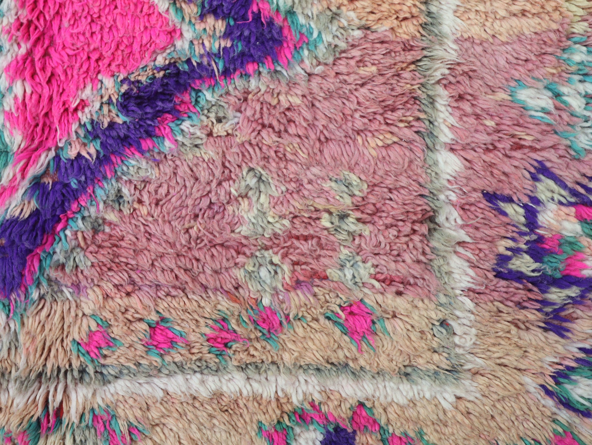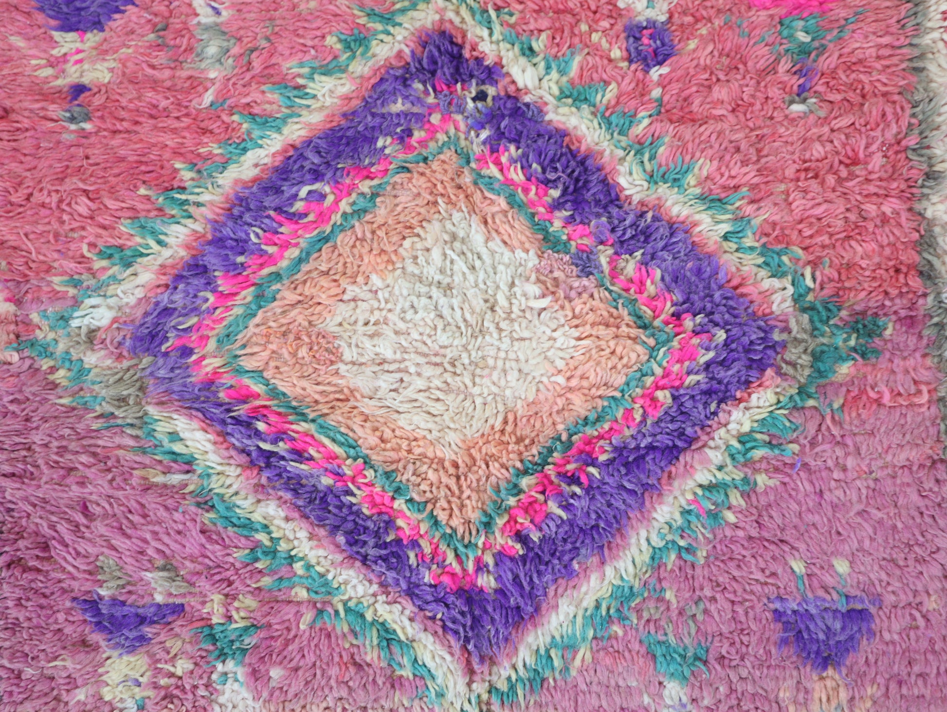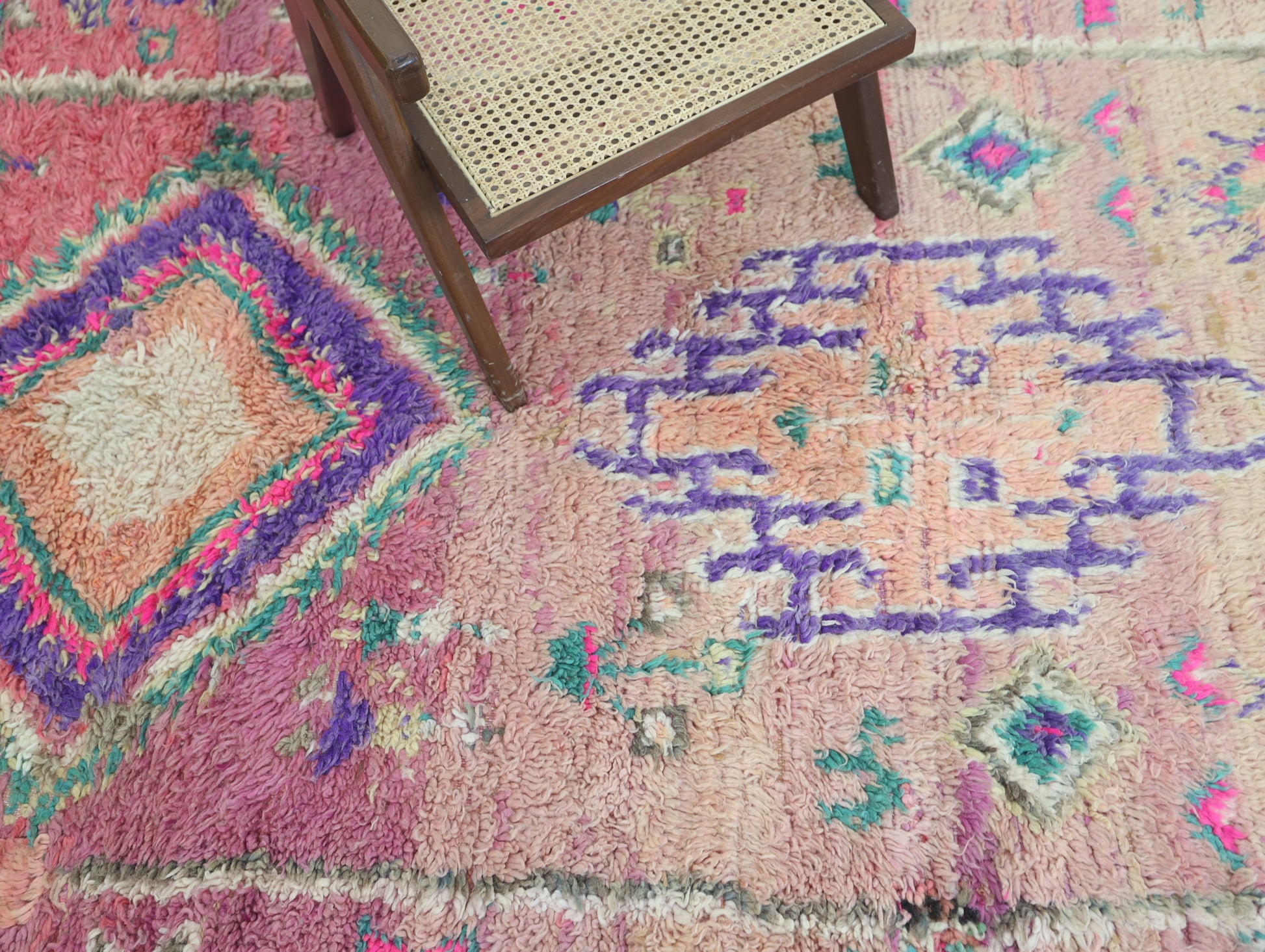 Wool, a sacred material for the Amazigh (Berber) people, forms the cornerstone of Moroccan rug design. Durable, long-lasting, and soft underfoot, wool is both functional and comfortable. In this piece, the wool pile is expertly knotted onto a wool foundation, adding substance and allowing it to gracefully embrace the floor.