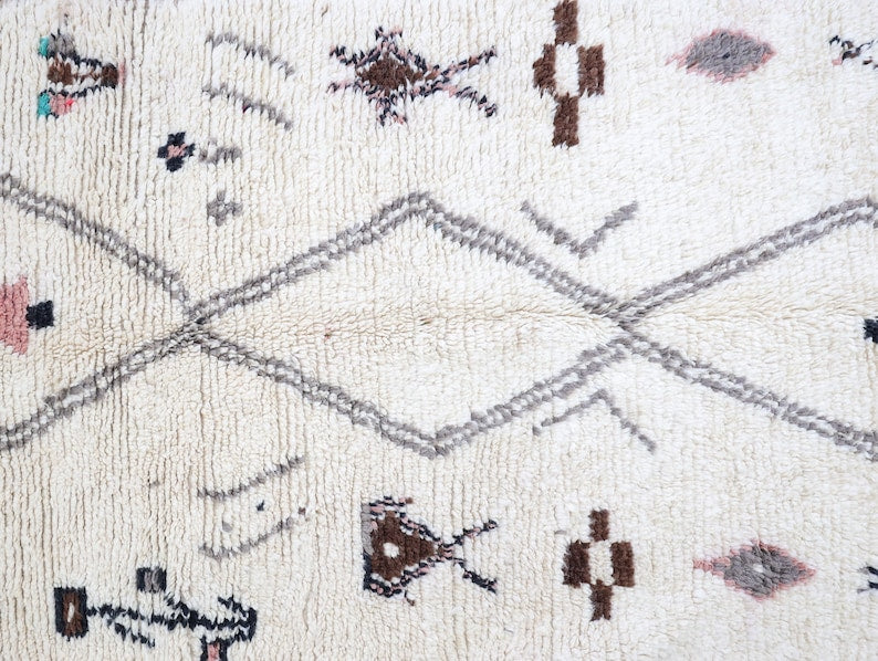 Azilal rugs boast abstract, painterly designs reminiscent of rugs from Ourika. What sets them apart is a vibrant color palette, achieved through the incorporation of cotton alongside wool.