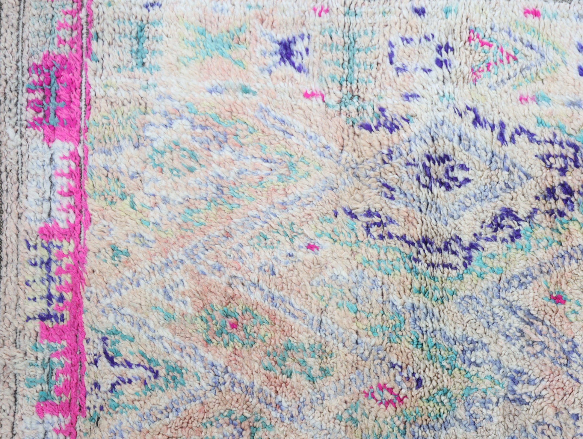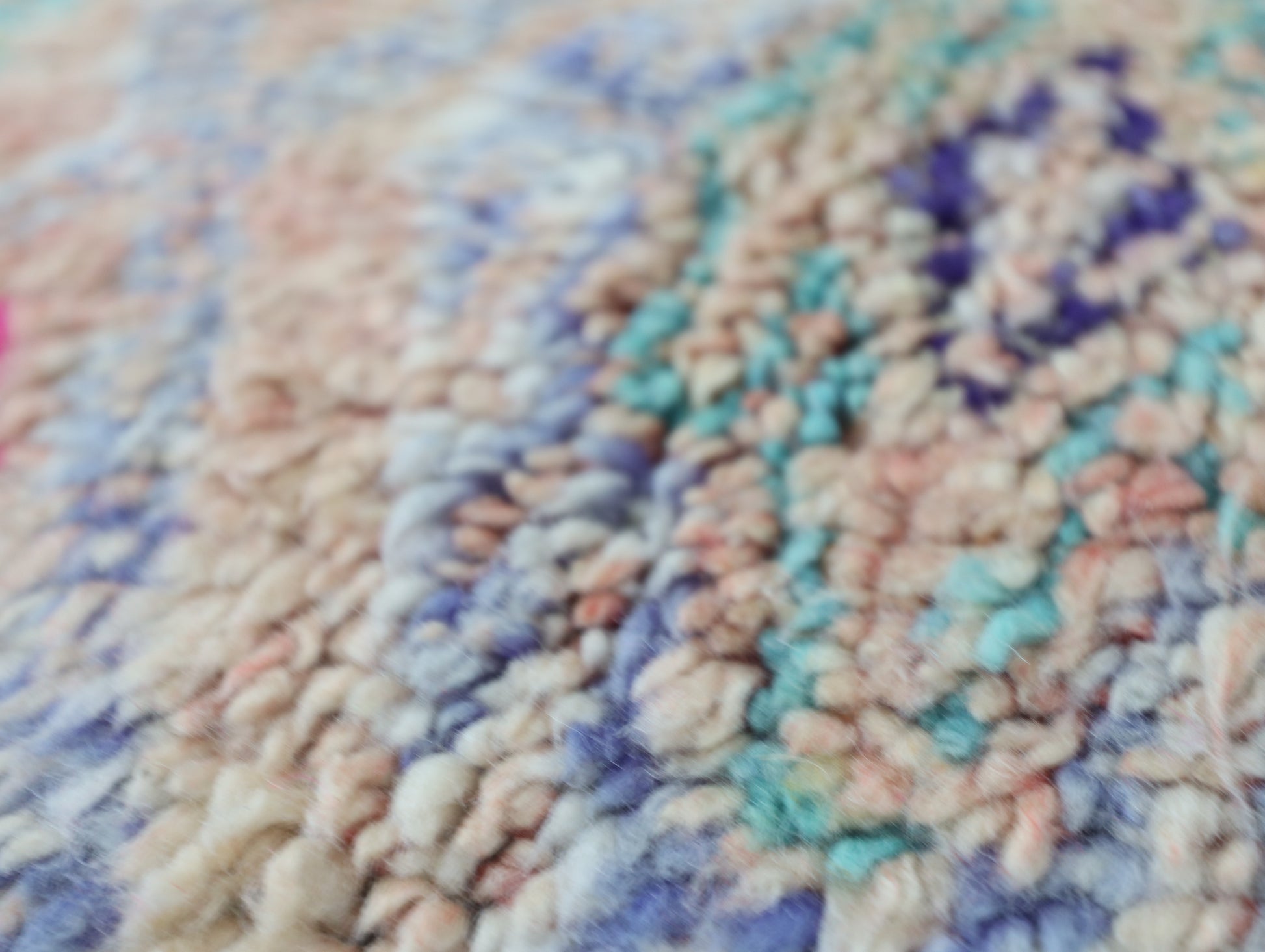 Originating in the Holy town of Boujad, these rugs, woven by diverse tribes, exhibit a wide spectrum of color, composition, and weave. Described as surreal, mystic, and mesmerizing, Boujad rugs transport us to a world beyond reality. Their construction, with twice as many horizontal as vertical knots, renders them floppy and easy to move.