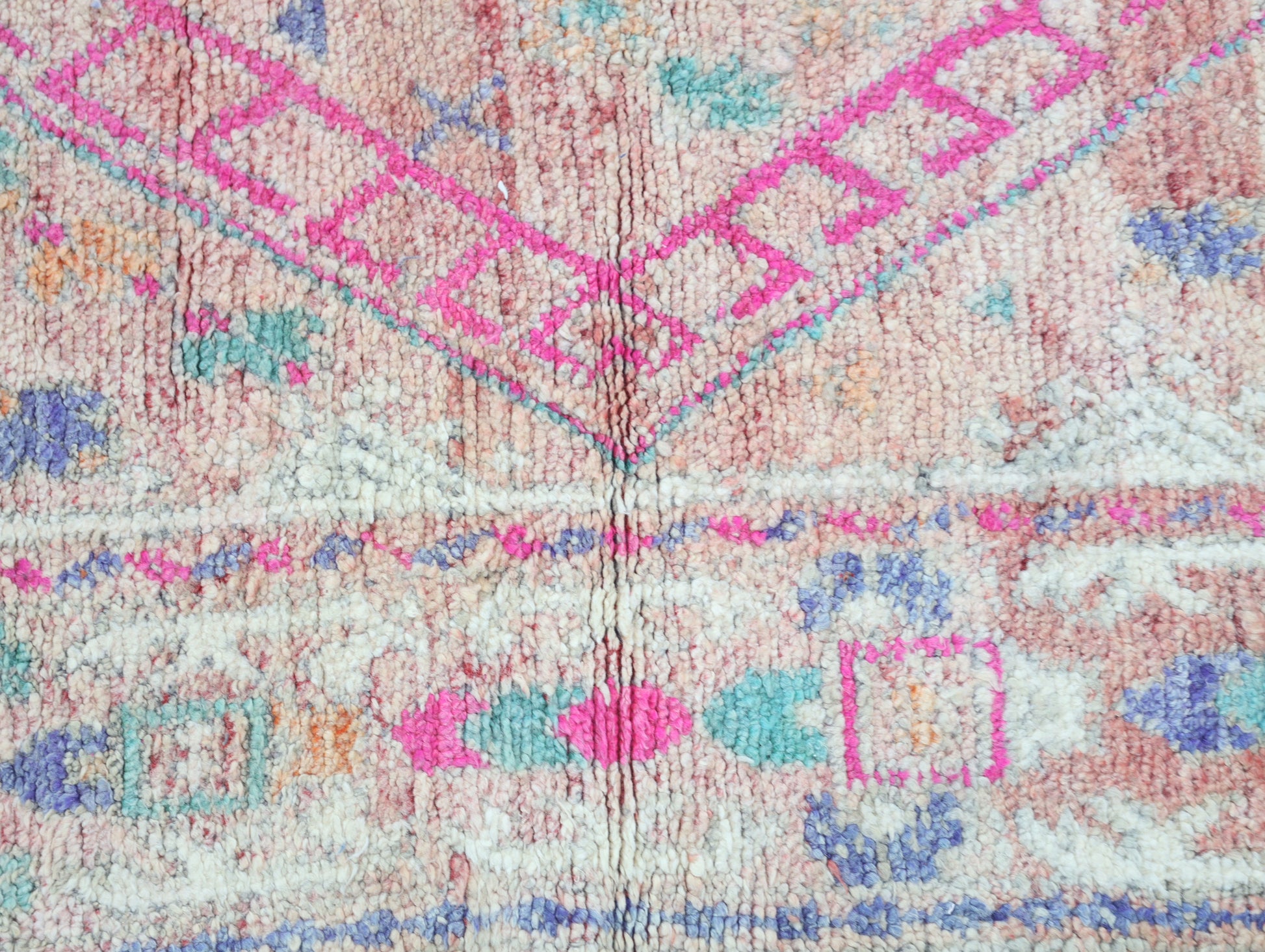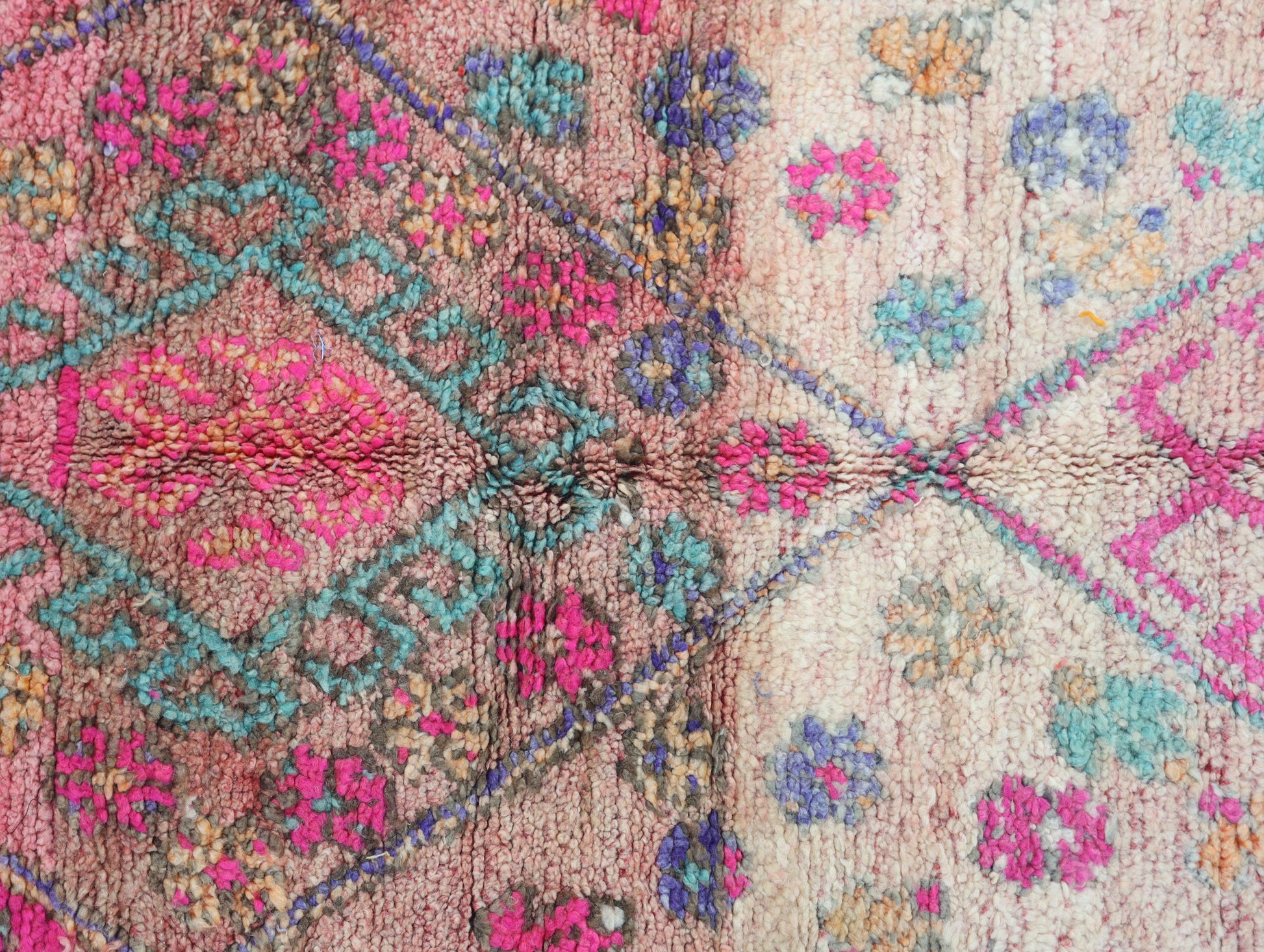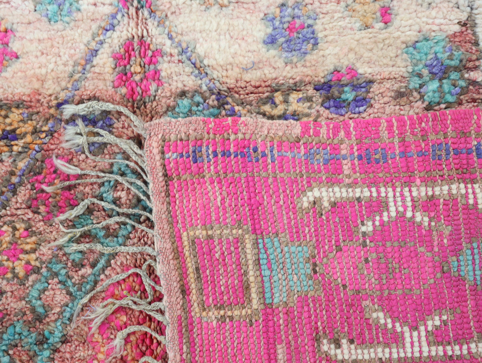 Originating in the Holy town of Boujad, these rugs, woven by diverse tribes, exhibit a wide spectrum of color, composition, and weave. Described as surreal, mystic, and mesmerizing, Boujad rugs transport us to a world beyond reality. Their construction, with twice as many horizontal as vertical knots, renders them floppy and easy to move.